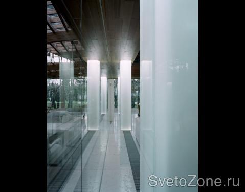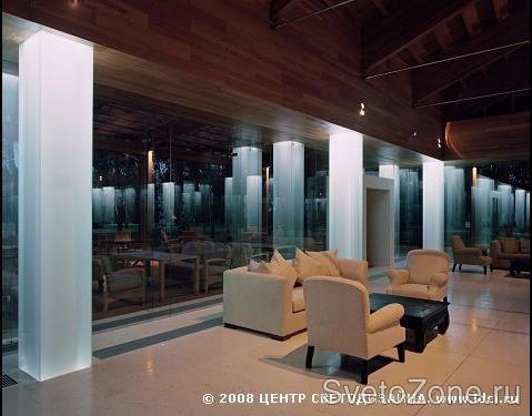 Единая концепция освещения всего комплекса заключается в том, чтобы размыть границы между существующими зданиями, полем для гольфа и внутренним интерьером, создавая, таким образом, единое пространство. Подсветка наследует этот принцип, доводя эту тему до совершенства в вечернее время. Внутри интерьера ресторана вертикальные световые колонны, которые не мешают любоваться окрестным пейзажем, подсвеченные таким образом, что пространство удивительно меняется и словно заполняется настоящим северным сиянием. Инновационные светильники делают возможным планирование до 10 световых сценариев, доступных нажатием лишь одной клавиши, что позволяет полностью визуально изменить пространство в зависимости от проводимого мероприятия. С приходом сумерек можно наблюдать, как границы стеклянных колонн полностью стираются и будто сливаются с естественным освещением. Таким образом, создается ощущение того, что крыша словно парит в воздухе. В это же время вступает в силу аккуратная и ненавязчивая ландшафтная подсветка гольф-поля. Она спроектирована таки образом, что с самых дальних точек наблюдения не видно ни одного источника света, обеспечивая удивительную глубину сцены. Свет словно путешествует из одного пространства в другое, оставляя легкий шлейф, в котором с легкостью угадывается принадлежность к единой концепции, общему настрое |