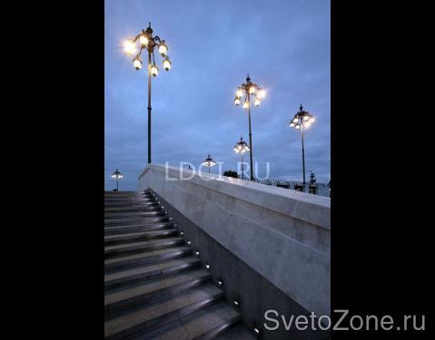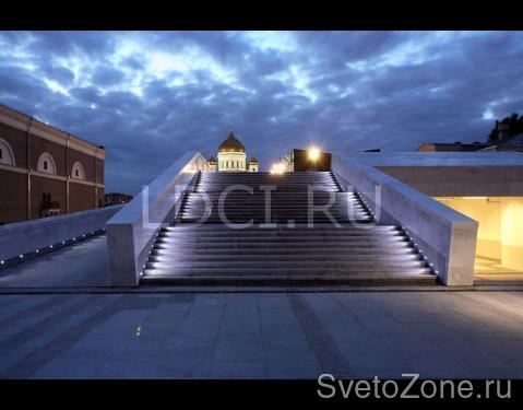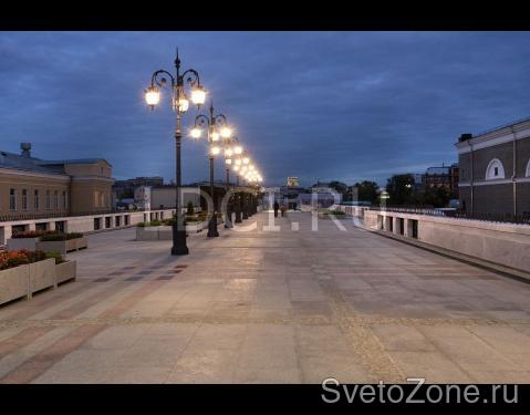 Общее освещение пешеходной зоны обеспечивается металлогалогенными лампами, установленными в декоративных модулях из трех и шести светильников, установленных на чугунных опорах высотой 6 и 10 м соответственно. В десятиметровых фонарях установлена специальная оптика, снижающая слепимость и обеспечивающая равномерное освещение "площади" над Берсеневской набережной. В ограждения моста, пандусов и сходов встроены миниатюрные светодиодные светильники. |