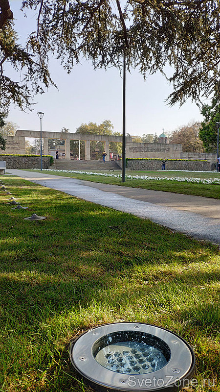 Для освещения крон деревьев парковой зоны установлены прожекторы встраиваемого типа GRIVEN DUNE MK2 WHITE. Приборы оснащены белыми светодиодами различной цветности в соответствии с типом освещаемых деревьев (хвойные или породы лиственных), а также в целях формирования визуальных акцентов в объеме территории. Интенсивность световой отдачи в соответствии с несколькими вариантами выбранной оптики позволяют филигранно высветить разномасштабные кроны и создать единое художественное световое полотно.