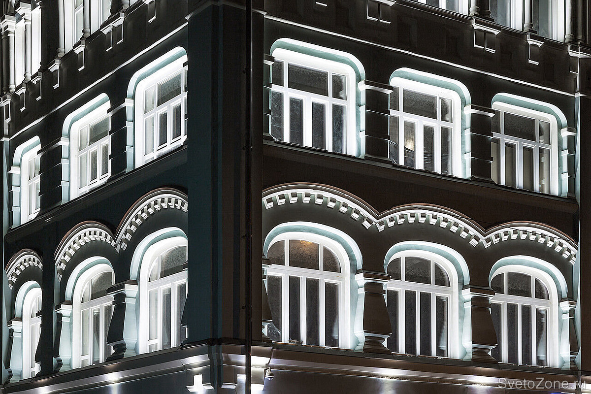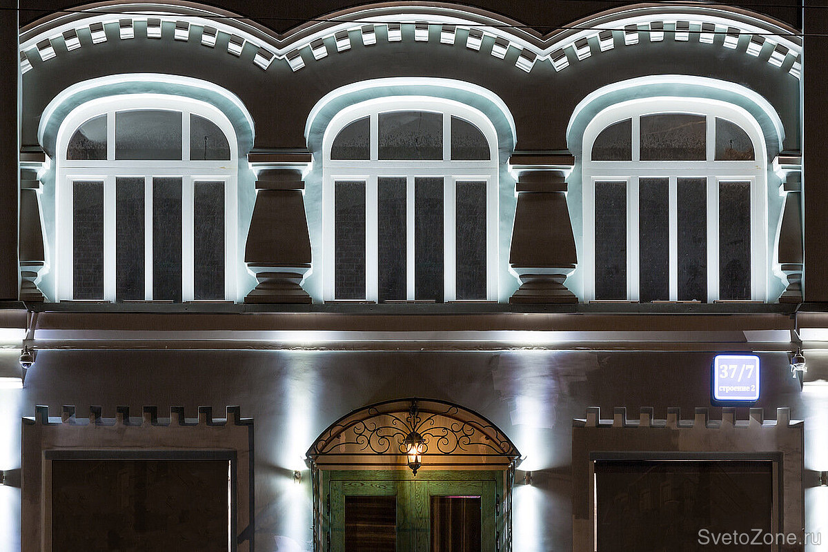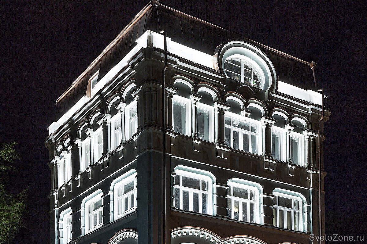 Этот проект полностью реализован на светодиодном оборудовании RADUGA и был сдан осенью 2016 года. Перед нами стояла задача дать этому зданию с интересной историей новую жизнь и помочь не затеряться на общем фоне одной из центральных улиц столицы.