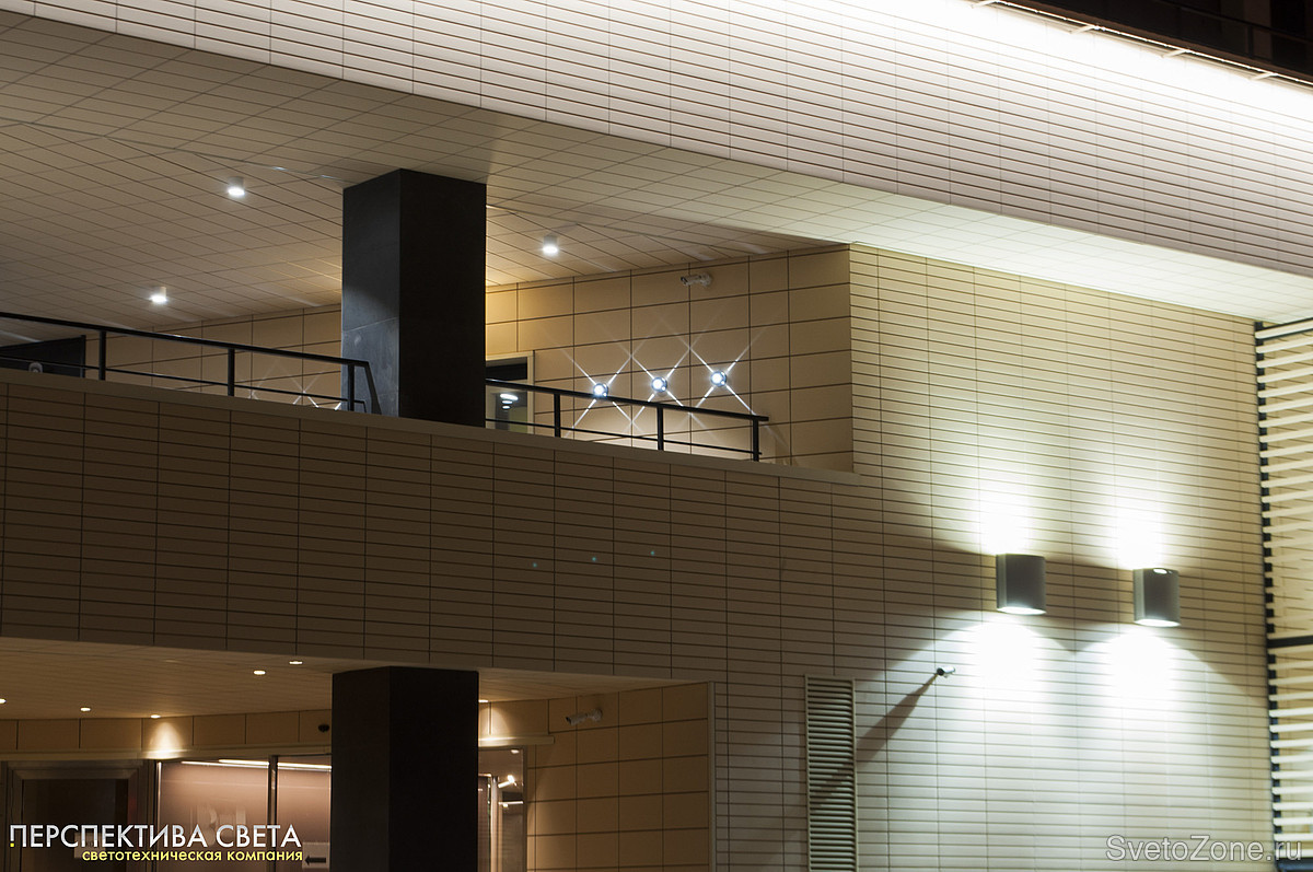 В проекте использованы линейные светодиодные светильники различной температуры свечения. Декоративные светильники "Звезда", двусторонние фасадные бра и потолочные светодиодные светильники. |