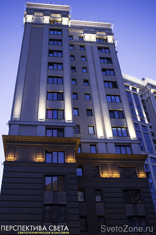 В проекте были использованы линейные светодиодные светильники для подсветки верхней части здания.
