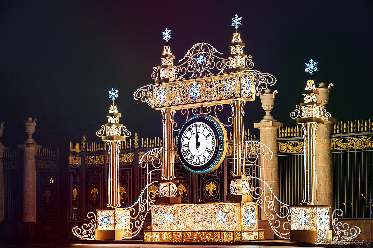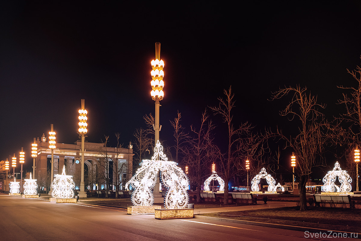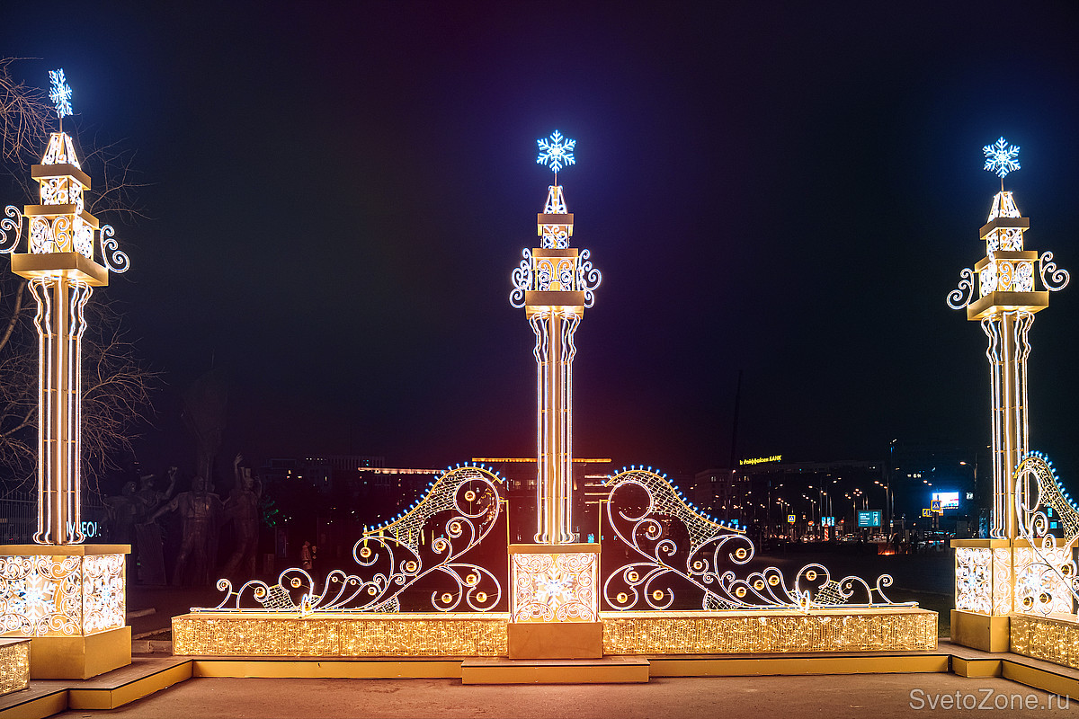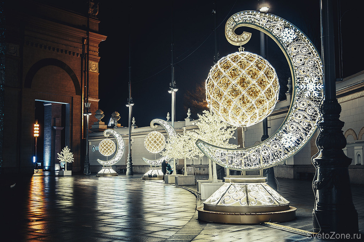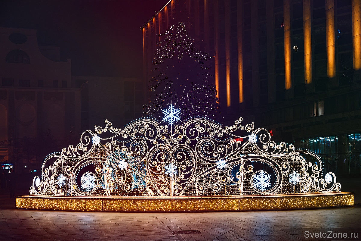 Создать такие ажурные узоры удалось за счет ручной работы с металлом. Сияние, напоминающее блеск ювелирного украшения, придает конструкциям бело-золотое патинирование. В ночное время браслеты, диадемы и шар зажигаются яркими, но деликатными огнями — такого эффекта удалось добиться за счет использования светодиодной ленты теплого белого свечения. Для декора использованы светодиодные снежинки. Инсталляции имеют эстетичный внешний вид в дневное время, когда освещение выключено, и продолжают выполнять декоративную функцию.