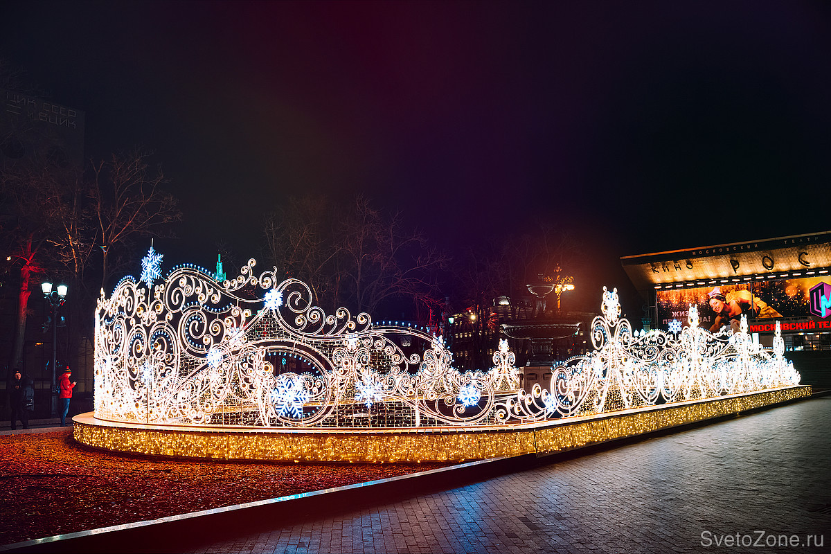 Украшенная инсталляциями "Скань" Театральная площадь стала одной из самых популярных локаций: в дни новогодних каникул практически круглые сутки здесь можно было встретить гостей и жителей Москвы, снимающих фото и видео на фоне инсталляций или внутри шара, прогуливающихся под арками-браслетами. |
