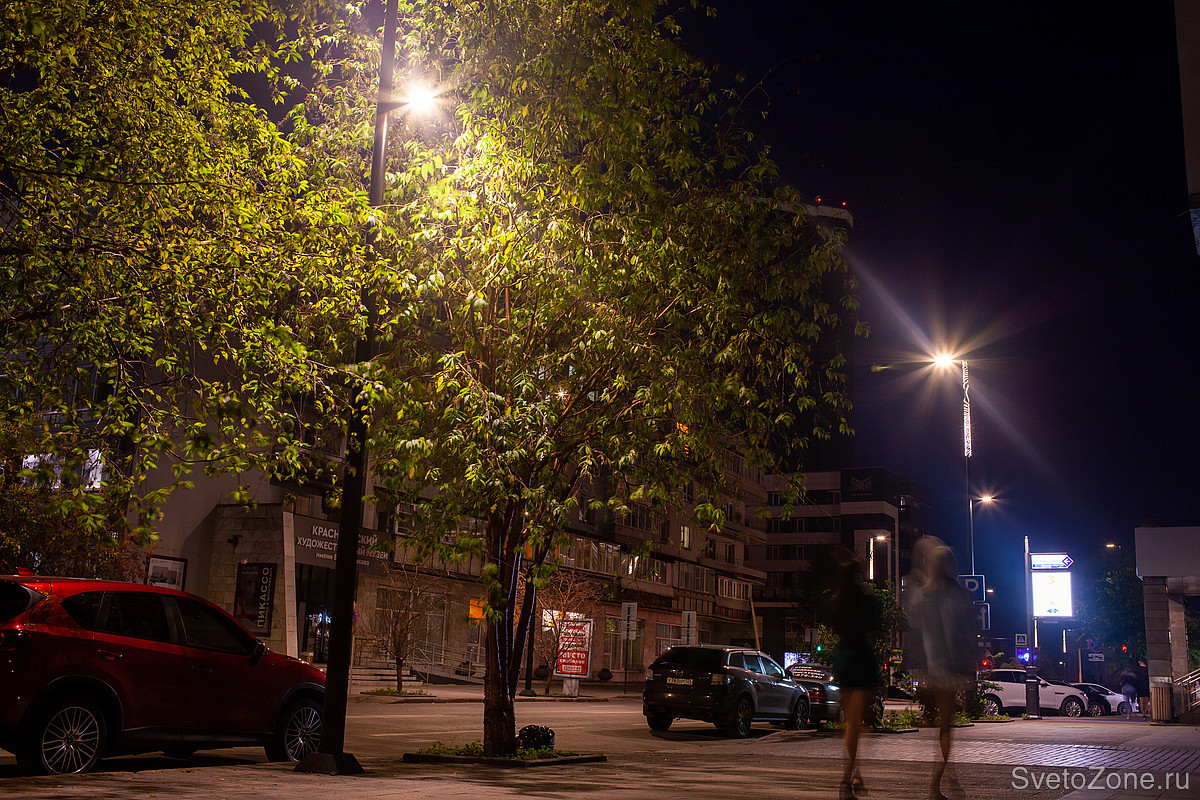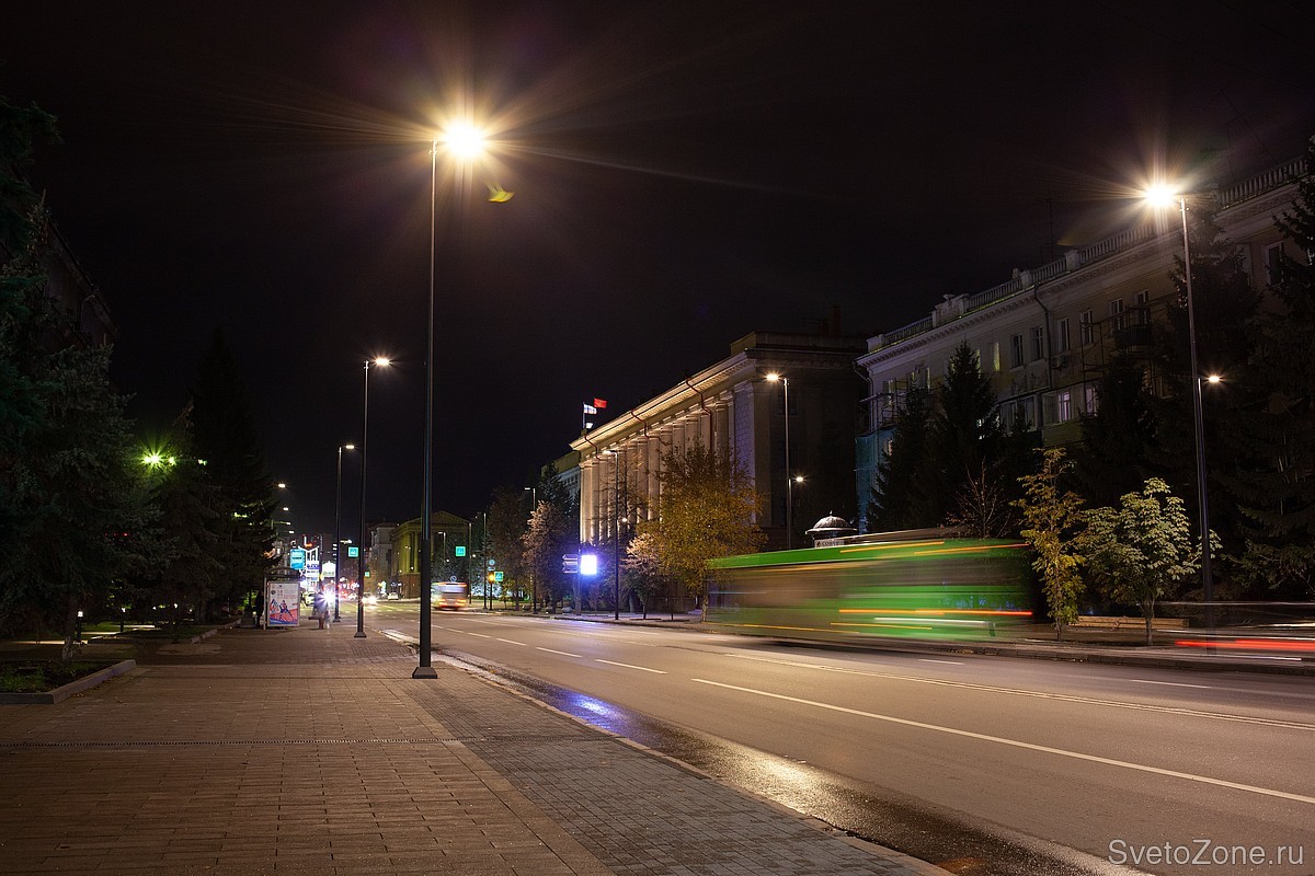 Большие общественные пространства: напротив Красноярского краевого суда, памятника художнику Андрею Поздееву, освещаются уличными светильниками LV-CITY x12 с опор высотой 6 метров.