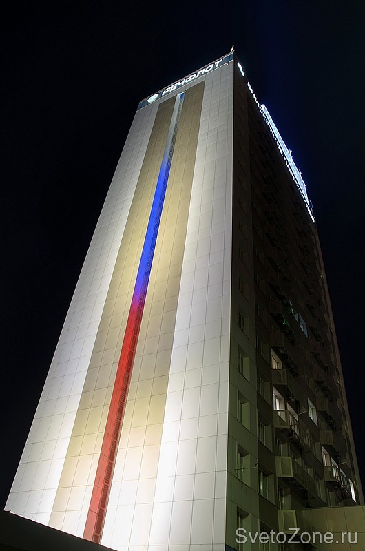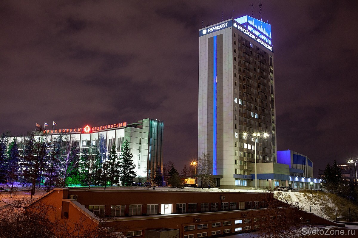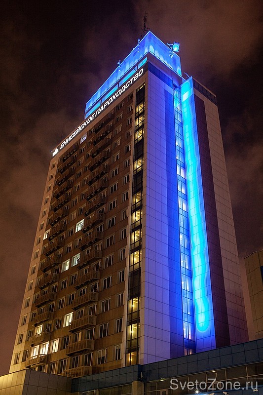 Для подсветки короны и ниши под ней использовались линейные светодиодные светильники LV-POWERLINE х24. На торцах здания установлены LV-POWERLINE х32, формирующие вертикальные полосы подсветки в высоту здания. Плоскость стены с надписью «Речфлот» подсвечивается белым. Такая подсветка создается с помощью светильников LV-PRO х24, х36 и х48.