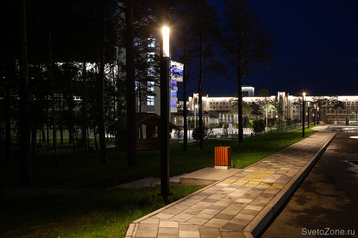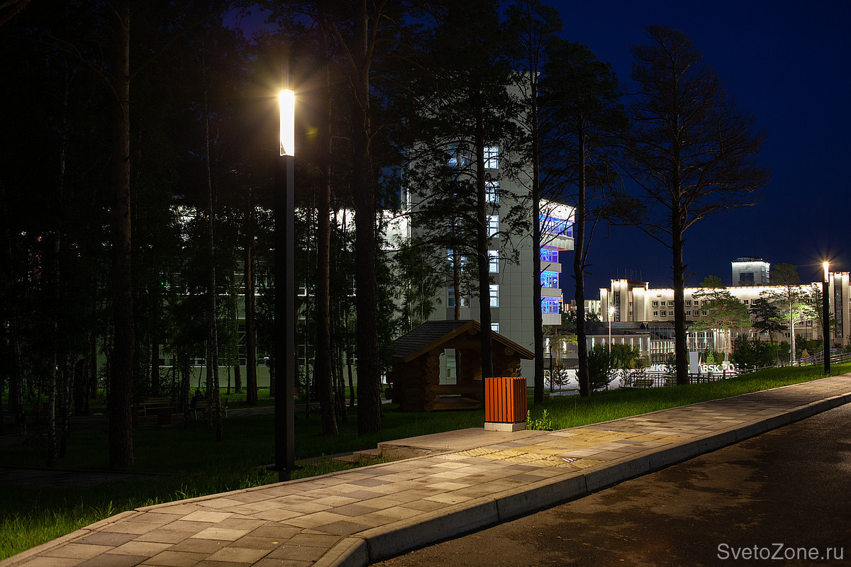 Светильники Ledvizor сочетают в себе строгий дизайн, антивандальность и мягкий свет. Подобранное оборудование с теплой цветовой температурой 3000К создаёт чувство уюта и комфорта во время вечерних прогулок по территории кампуса.