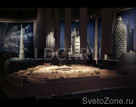 Второй вариант концепции dramatic light. Этот вариант освещения более эмоциональный и контрастный, предполагал локальное распределение света. Узкие лучи, полученные благодаря использованию отражателей 4° и 8°, направлялись лишь на макеты, оставляя в полумраке не только пространство между ними, но и постаменты, на которых они расположены.