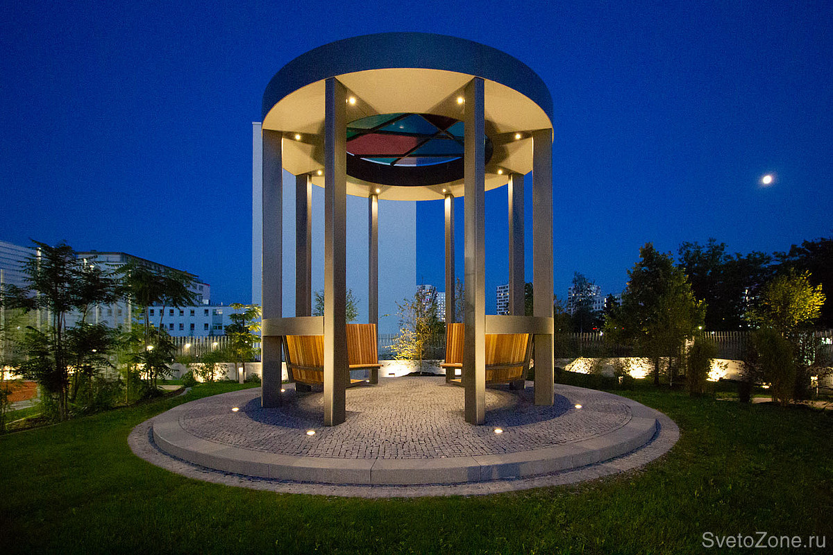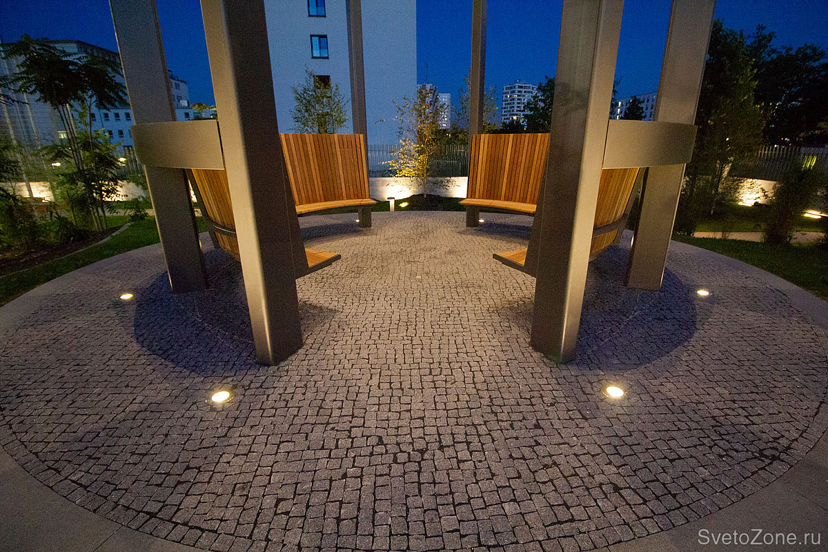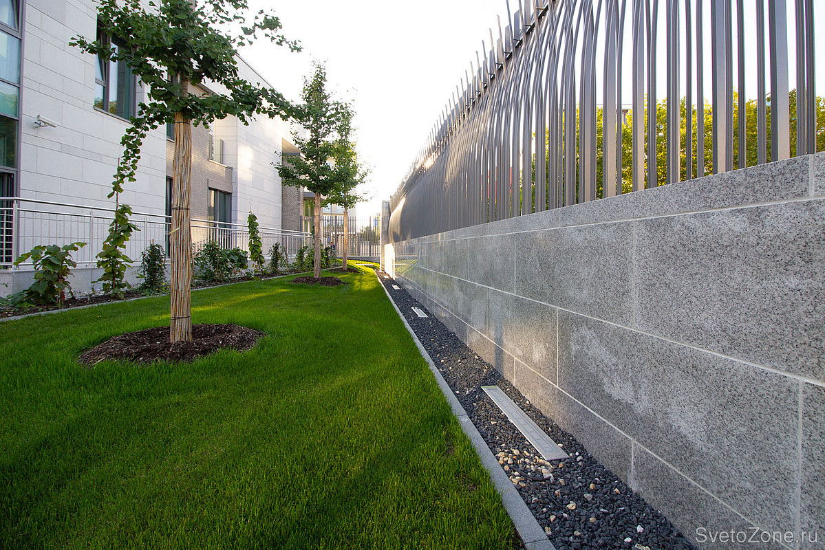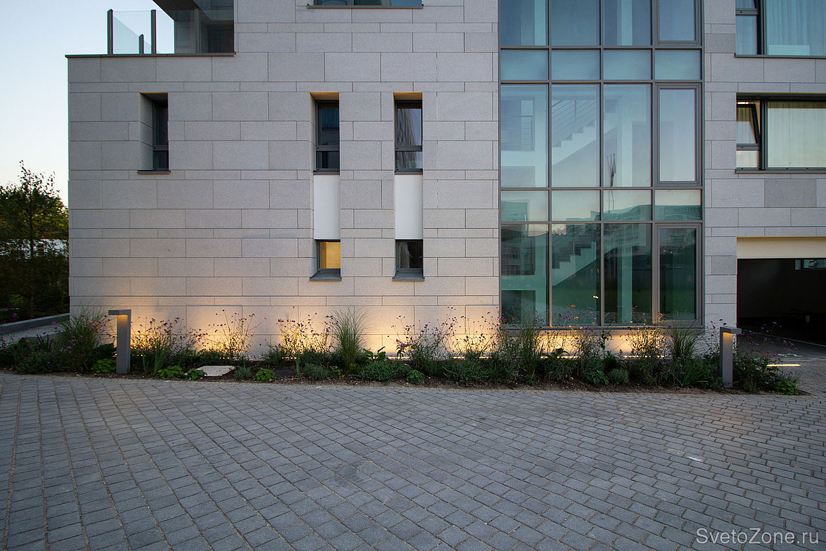 Состав осветительной установки дополнен дизайнерскими решениями HESS — опорами и боллардами LINEA, прожекторами NOVARA S, встраиваемыми прожекторами RAVENNA и линейными светильниками LEDIA, настенными светильниками CASSINO. Система интеллектуального освещения ARINI в заказном исполнении оснащена световыми решениями GRIVEN.