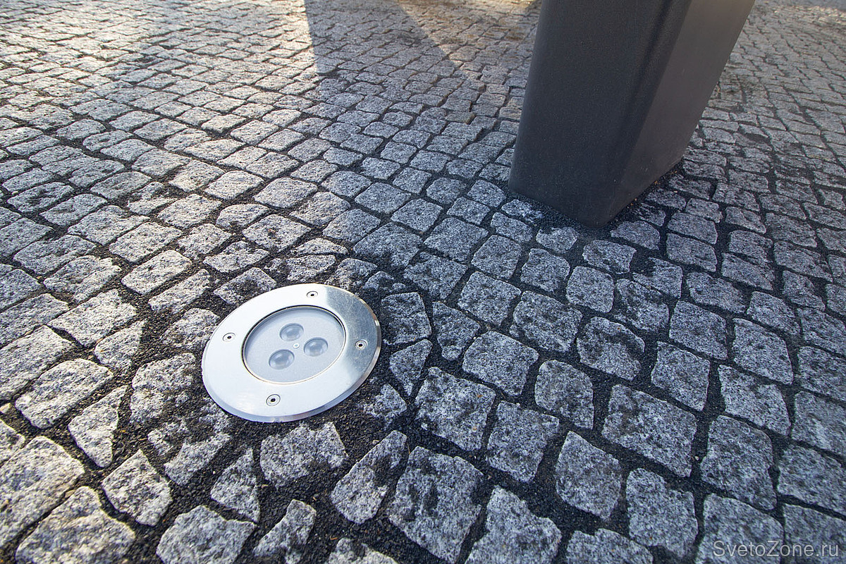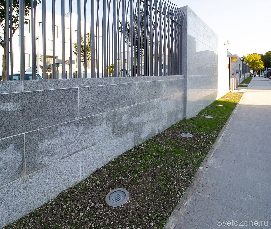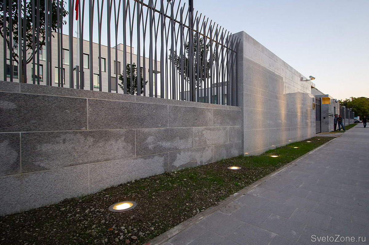 Встраиваемые прожекторы GRIVEN RUBY RECESSED установлены около стен входной зоны и рядом с воротами КПП.