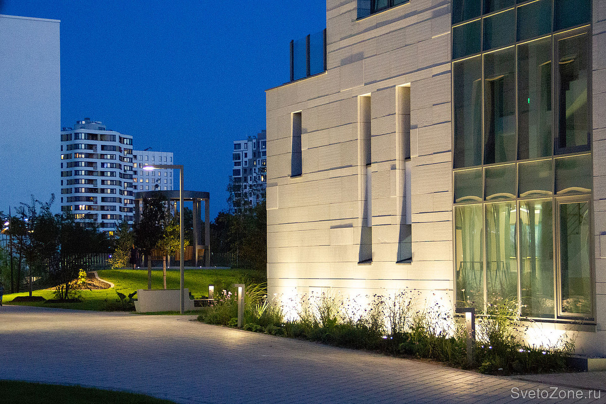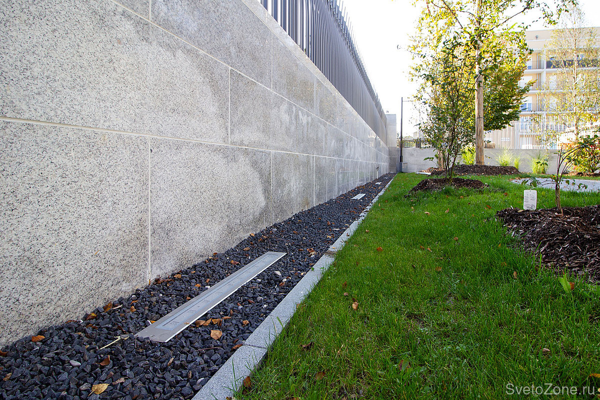 Около 200 светодиодных линеек встраиваемого типа GRIVEN PARADE S-W-40 RECESSED в исполнении с диодами теплого белого цвета и оптикой Wall Wash (кососвет) освещают основание периметральных стен и фасады зданий комплекса.