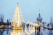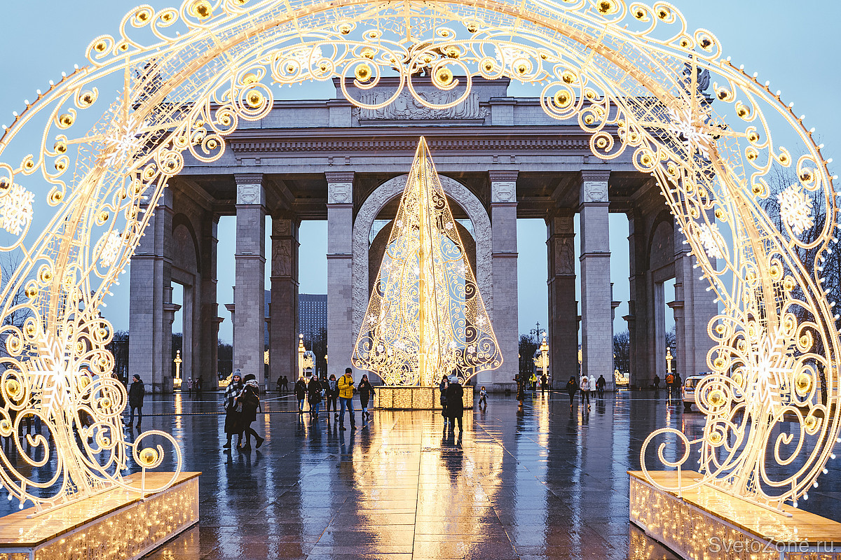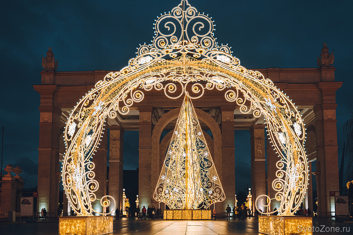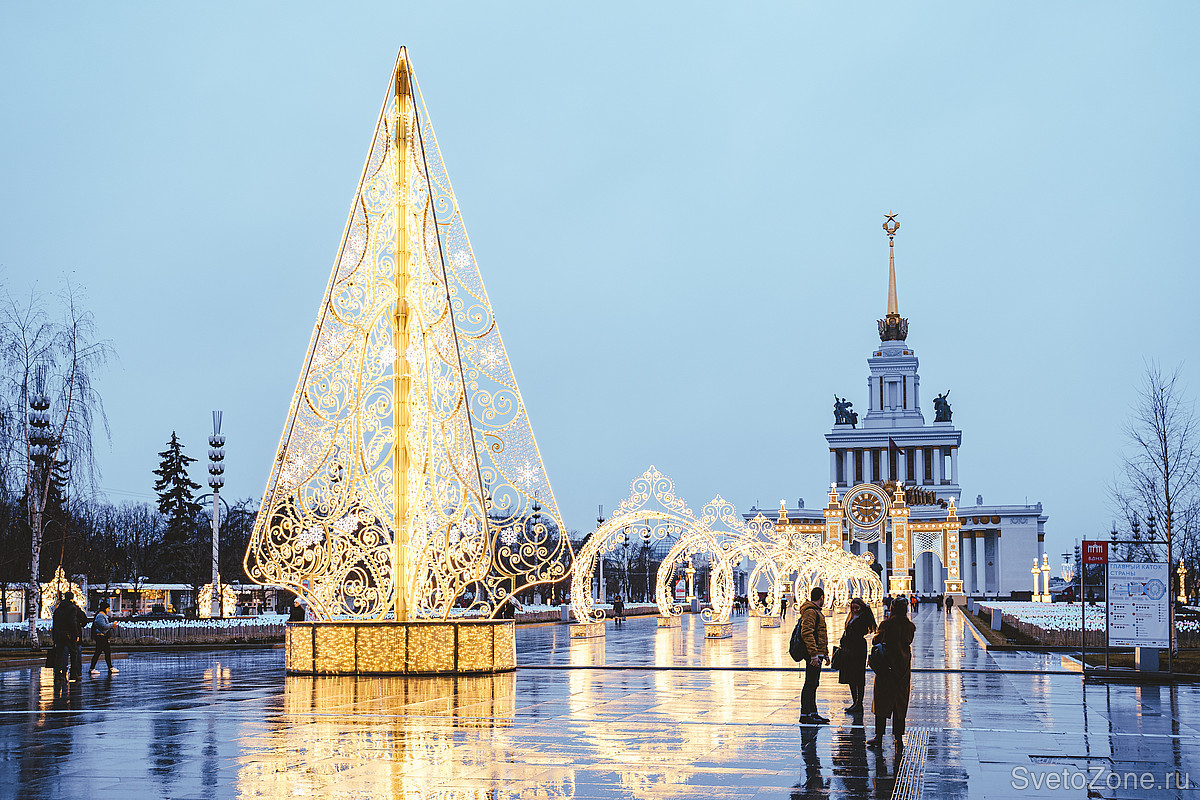 Одной из первых украшенных локаций стала территория ВДНХ. Помимо многочисленных световых инсталляций здесь появилась световая ажурная ель высотой 13 метров.