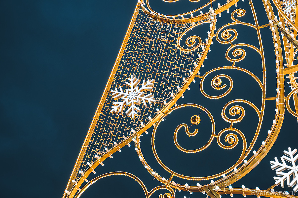 Для светового оформления выбран теплый белый свет, который подчеркивает золотистый цвет металла. Для контраста введены холодные акценты из снежинок и контурных поясов с бэлт лайтом.