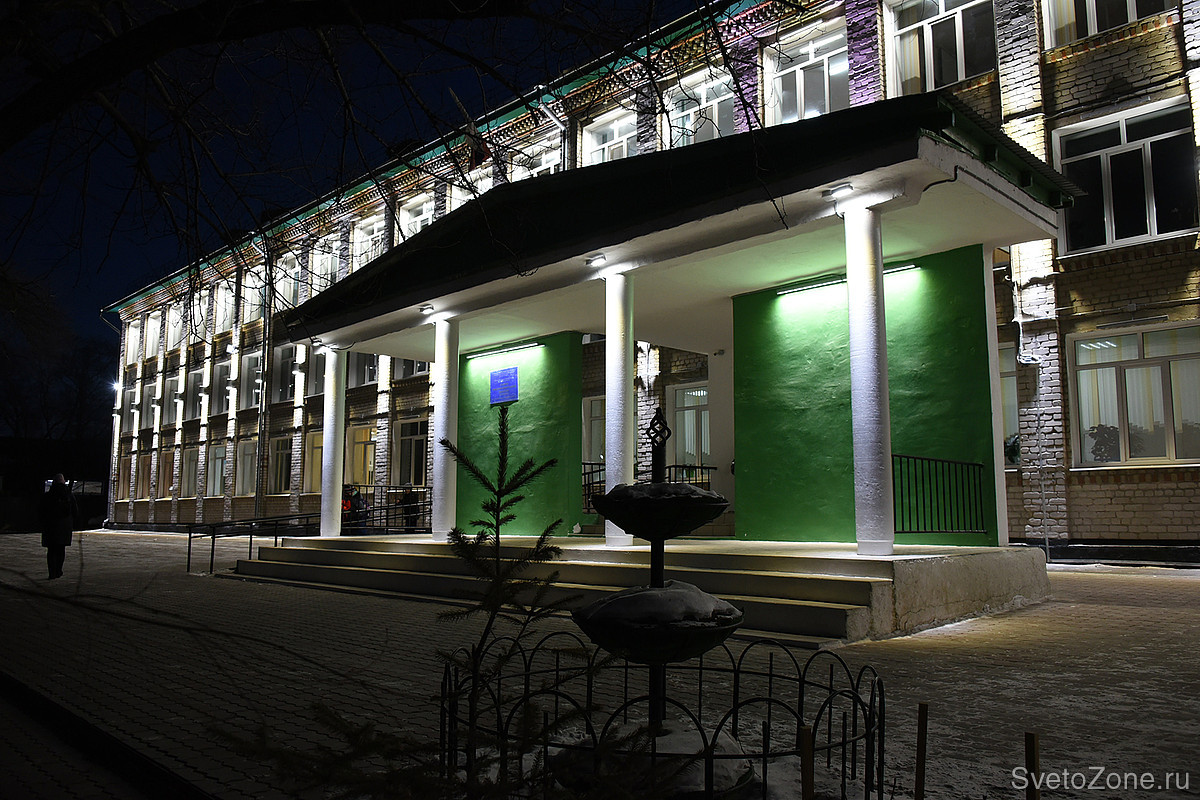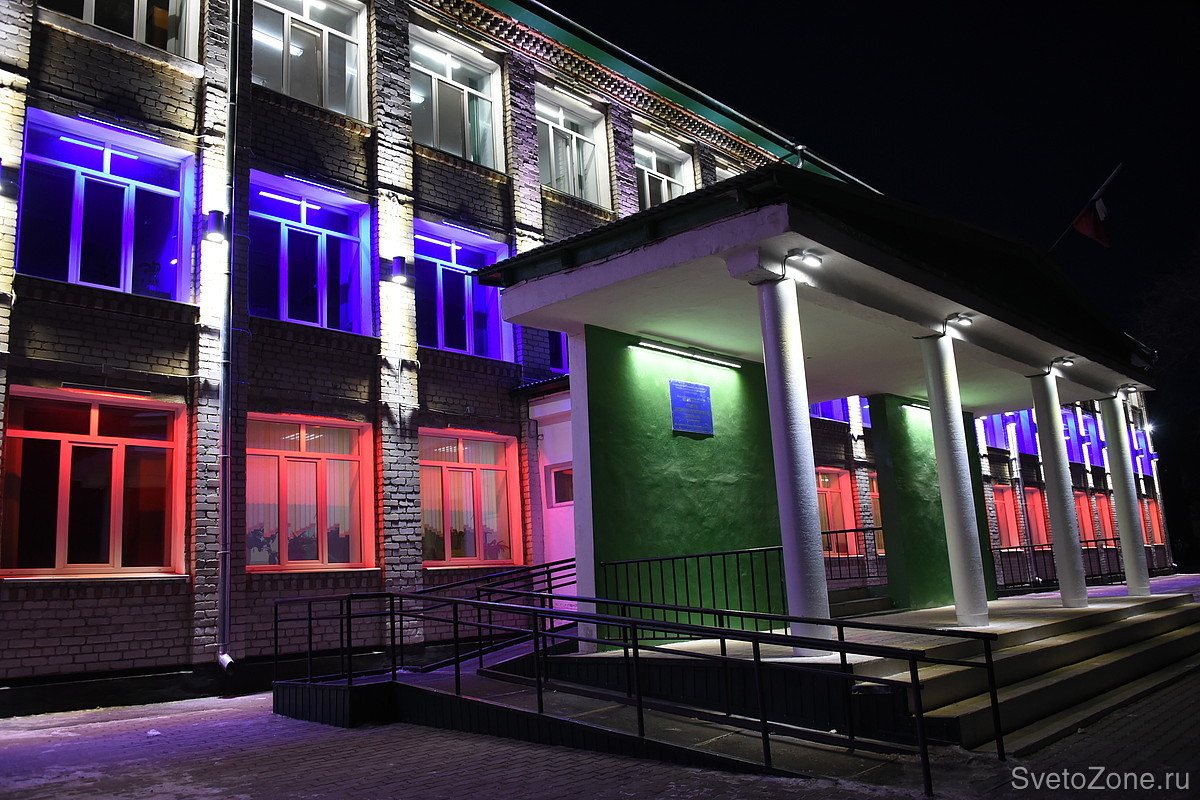 Освещение организовали по этажам - каждому достался свой цвет флага. Над каждым из почти 100 окон на фасаде школы установили светодиодные светильники серии FWL.