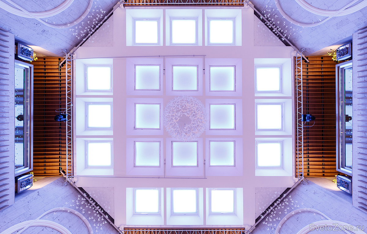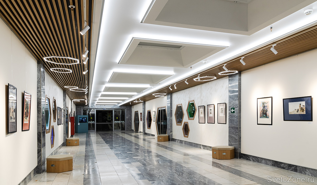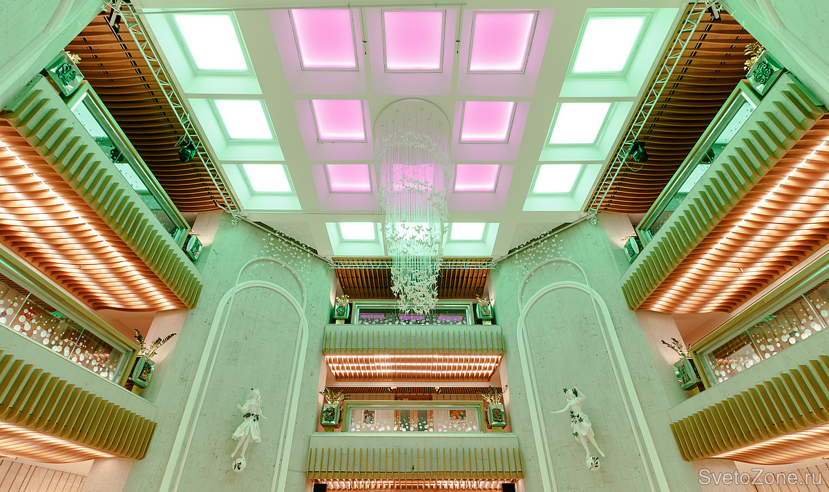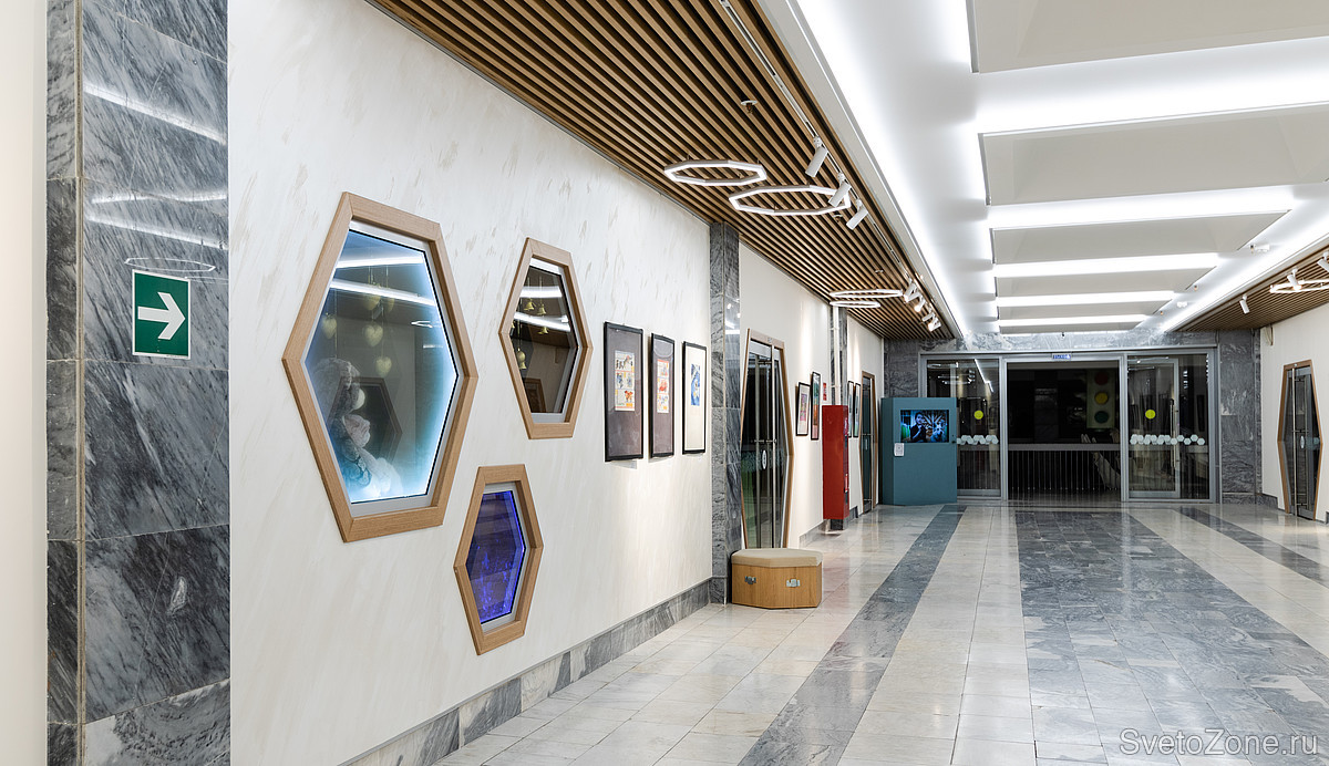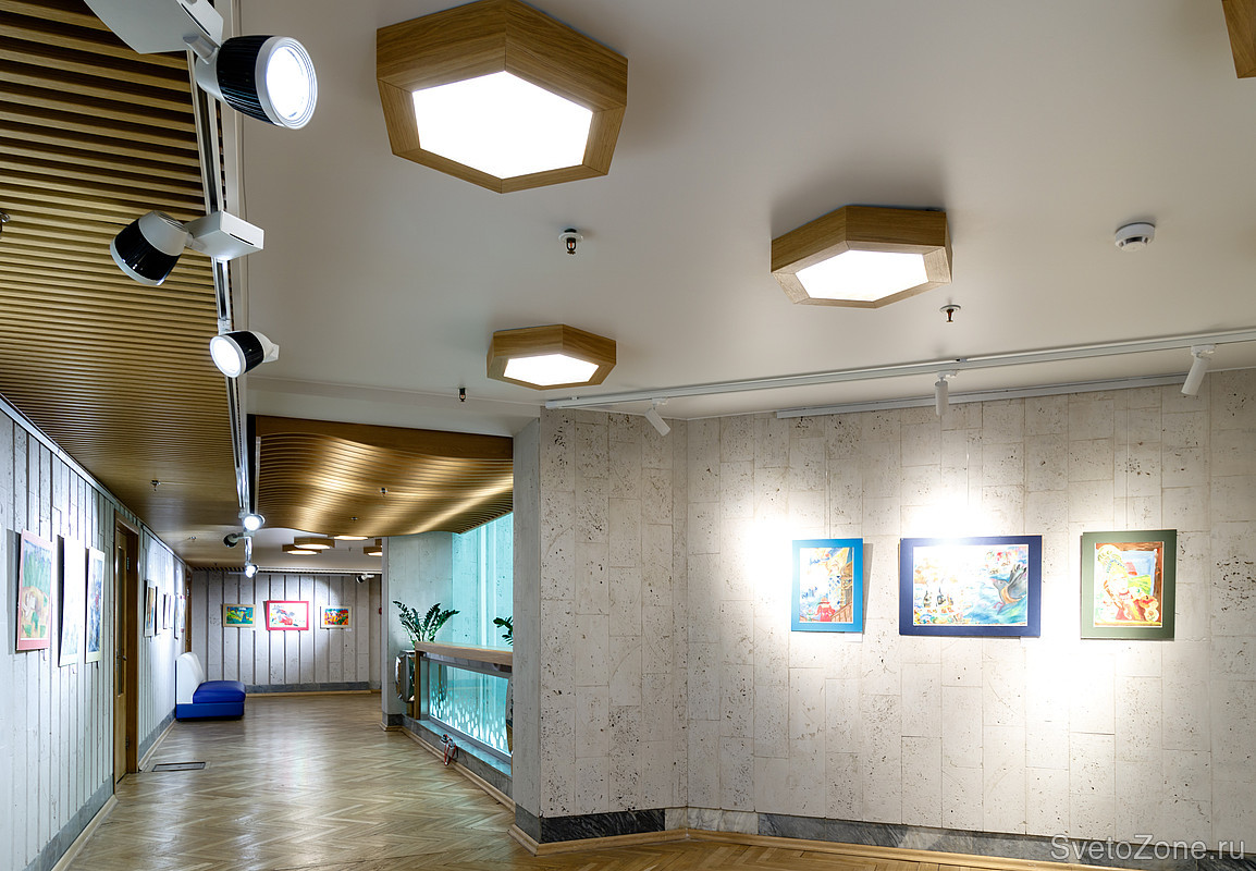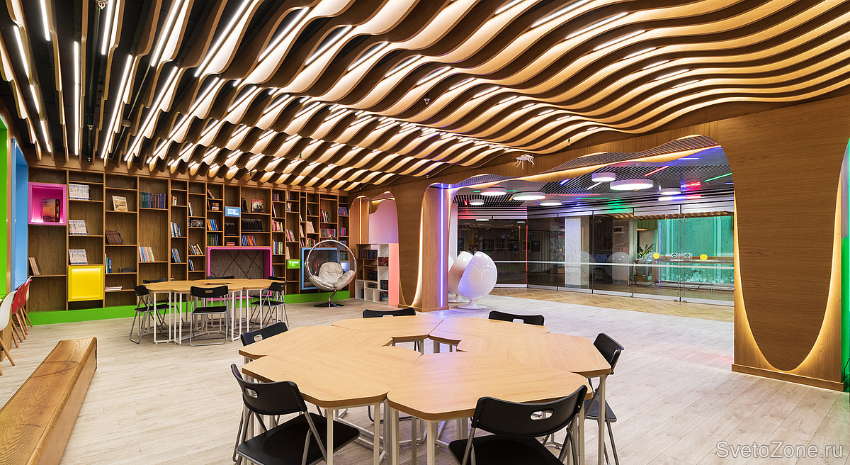 Невероятно красивый и масштабный проект с использованием максимального количества светодиодной ленты разных цветов свечения. Библиотека превращается в сказочное царство света, в котором герои книг могут оживать в воображении маленьких читателей. При этом свет гармоничен и не отвлекает от главного занятия — чтения книг. Цвет свечения лент изменяется с помощью пультов управления. Потолочные светильники похожи на квадратные окна, сквозь которые как будто проникает солнечный свет. Эффекта волн на потолке в другой