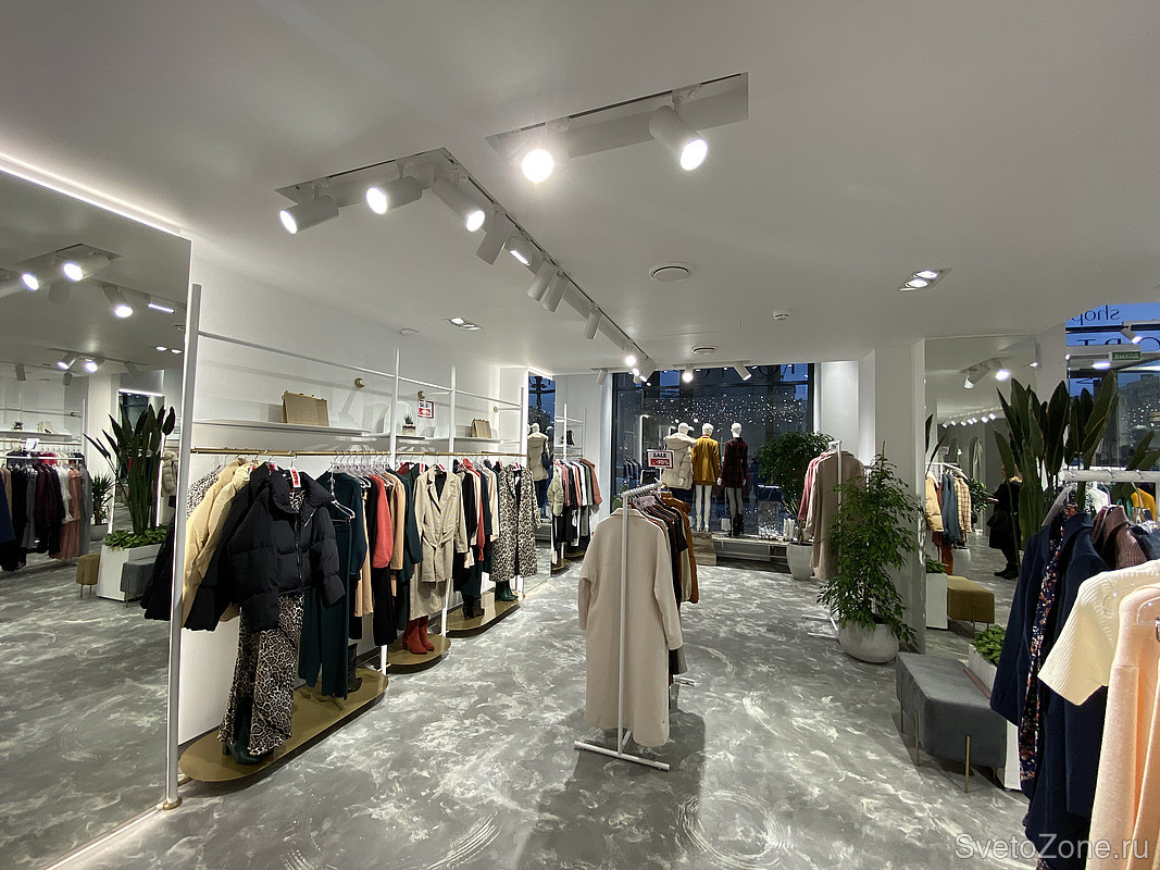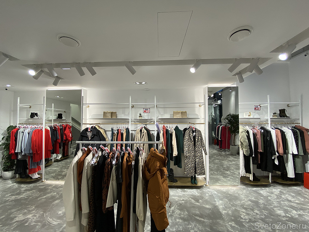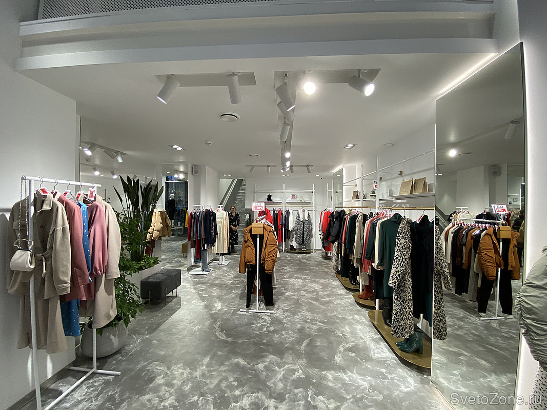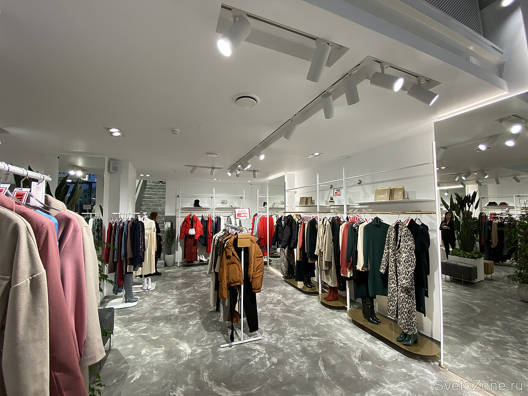 Проект освещения реализован с помощью подвесных светильников для треков/шин и светодиодных лент белого свечения. Дневной свет с высоким индексом цветопередачи идеально подчеркивает фактуру и цвет вещей, мотивируя на покупки. Трековые светильники с легкостью перемещаются вдоль шины, создавая акцентное и направленное освещение именно там, где это необходимо. Направление луча света можно менять в зависимости от экспозиции магазина и смены коллекций.