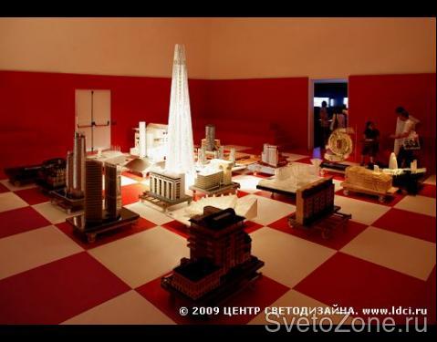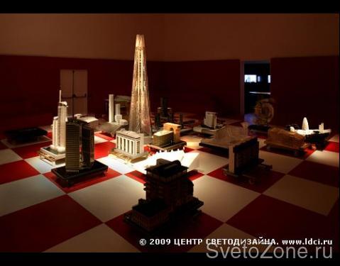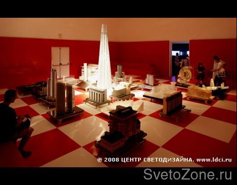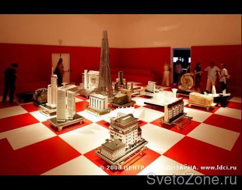Российский стенд состоит из двух залов - верхнего и нижнего, каждый из которых имеет своя яркий световой портрет, созданный Центром Светодизайна. Поднявшись на второй этаж, в верхний зал, посетители попадают в настоящий город, каждое здание в котором - это шедевр современной российской и зарубежной архитектуры. Массивные, детально выполненные макеты установлены на одинаковом расстоянии друг от друга, и когда пятьдесят управляемых светильников запускают одну из своих шести программ, замысел дизайнеров становится ясен: зал превращается в гигантскую шахматную доску, на которой разыгрывается своеобразный турнир между российскими и зарубежными архитекторами за право формирование облика новой России. В этой партии установленная специалистами Центра Светодизайна программа высвечивает то российские, то зарубежные макеты, предоставляя посетителям прекрасную возможность оценить красоту шахматного сражения. |
