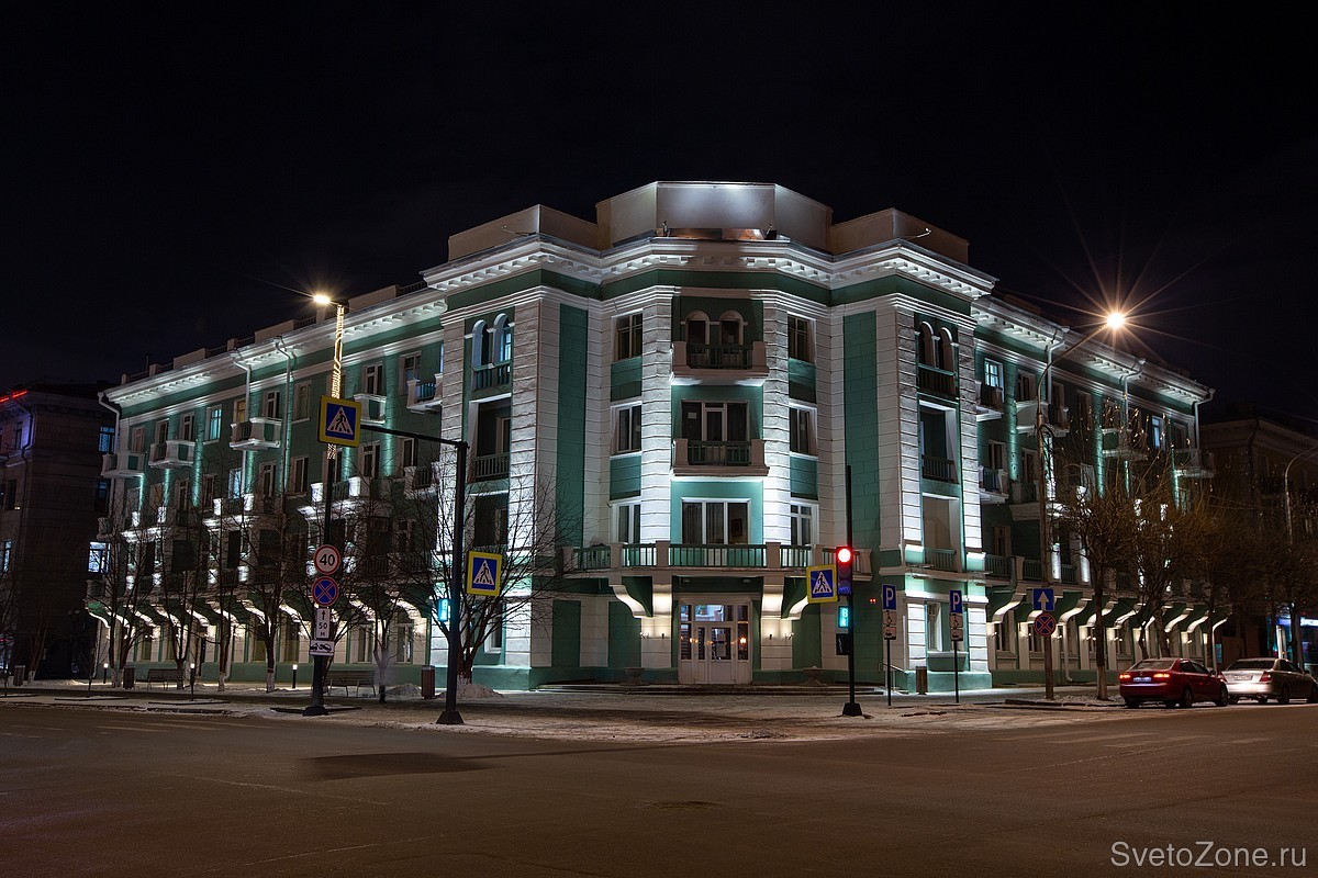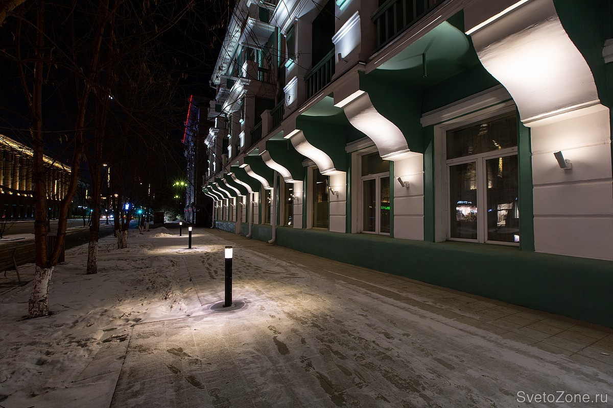 Линейные светильники LV-POWERLINE выделяют пилястры и центральную часть. Уличные светильники LV-FLOW TYPE A2 подсвечивают элементы балконов. Прожекторы LV-LIGHTSABER MINI бросают акценты на балконные пролеты между этажами и создают мягкое освещение венчающего карниза. Все светильники используются с различной оптикой, исходя из задачи освещения.