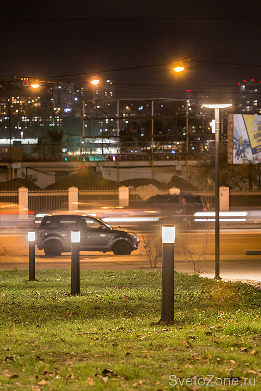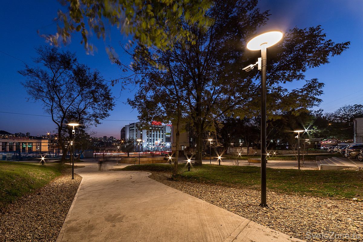 За освещение сквера отвечают уличные приборы LV-TORCHERE. Торшерные светильники подобраны с цветовой температурой в 3000 и установлены на опоры высотой 3,5 метра. Поэтому оборудование Ledvizor создаёт мягкое освещение и особо уютную атмосферу в сквере.