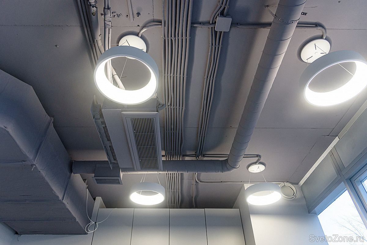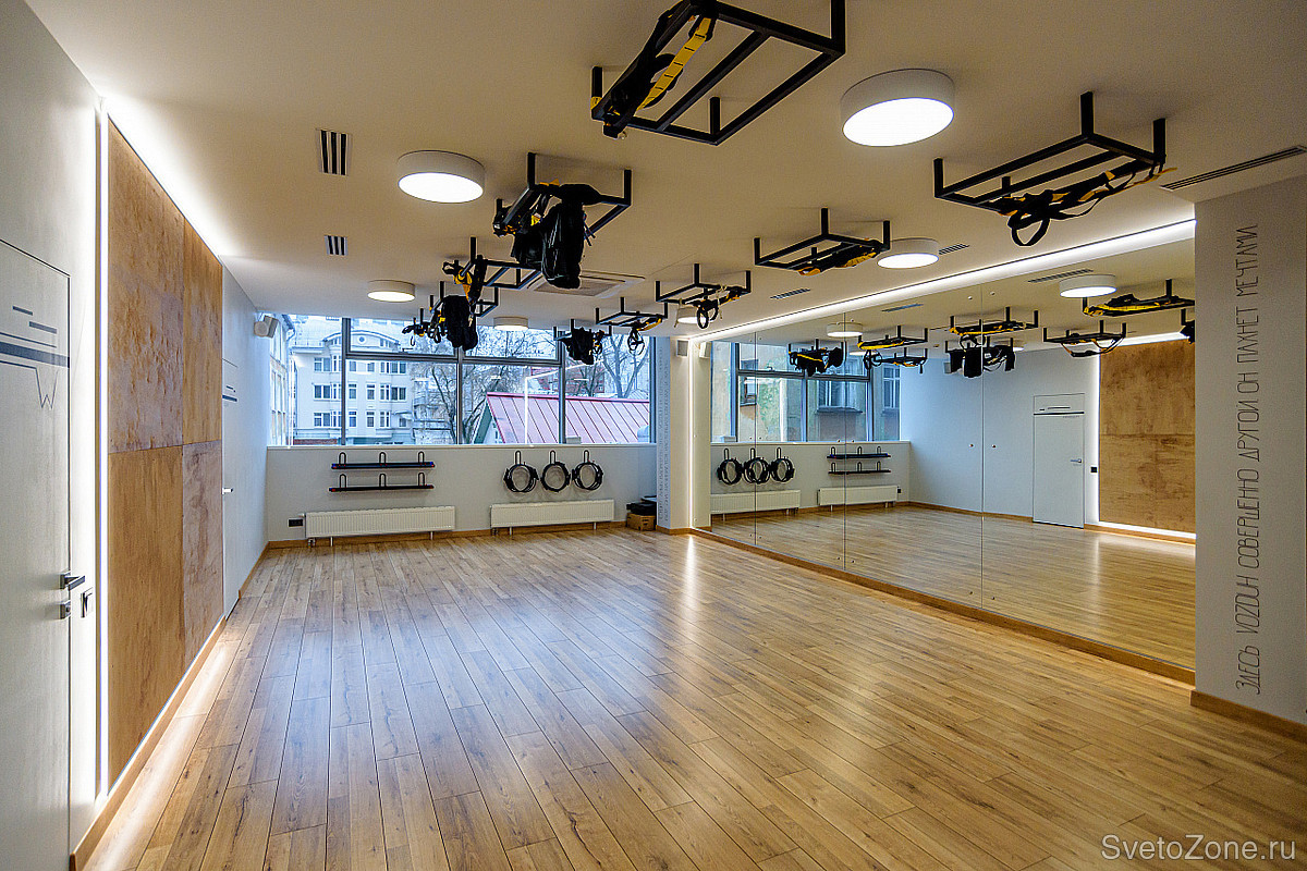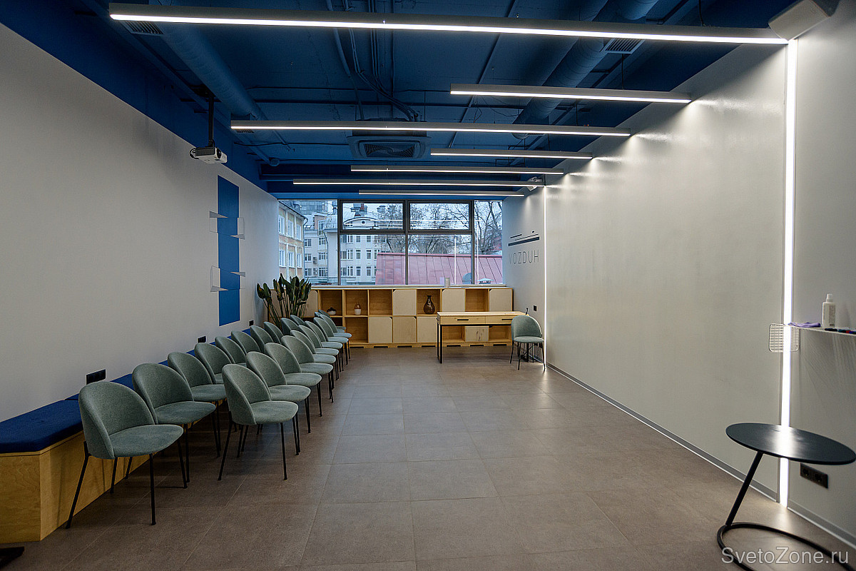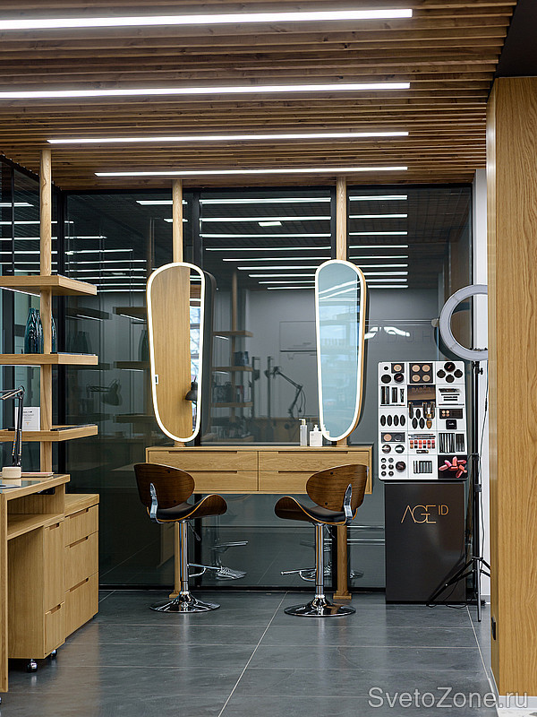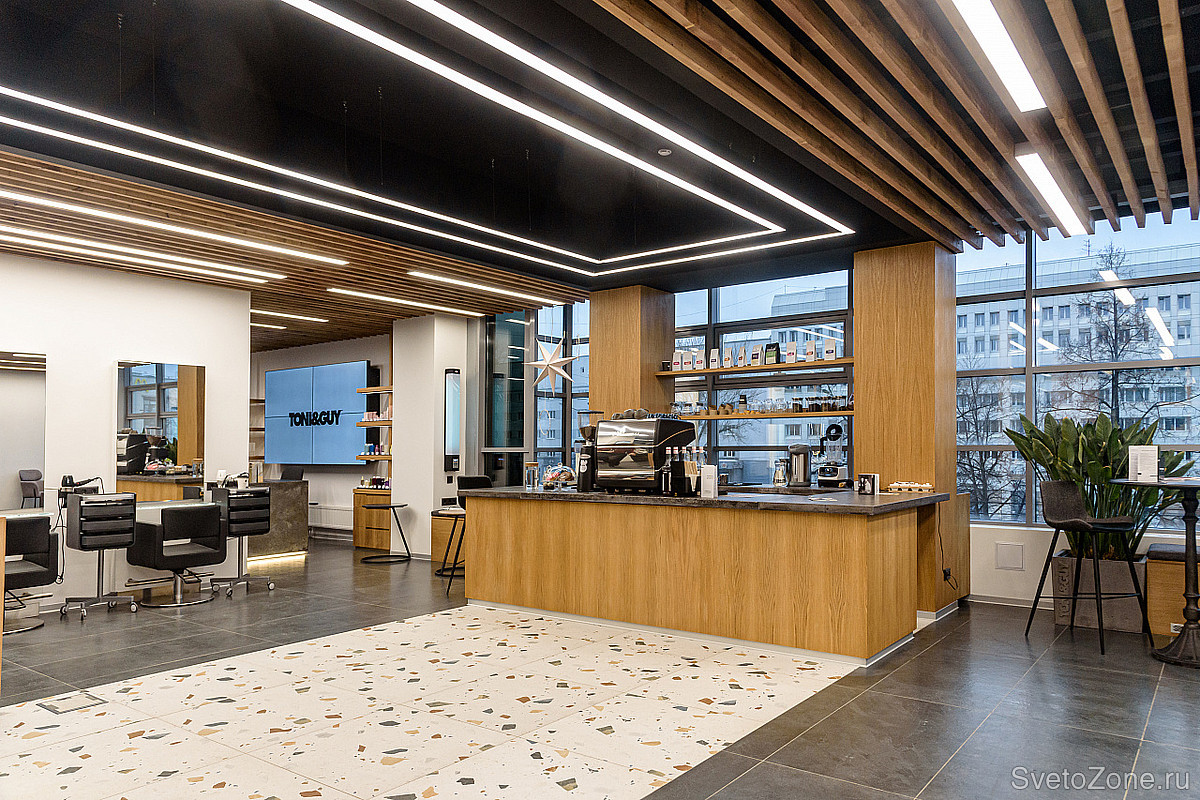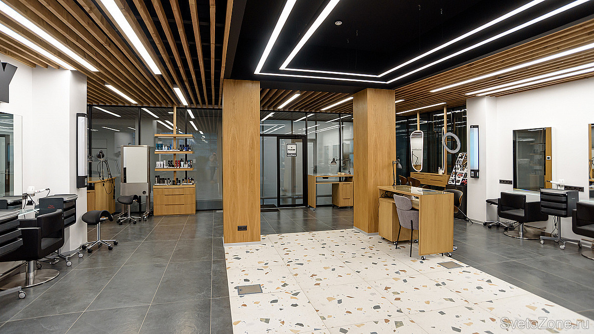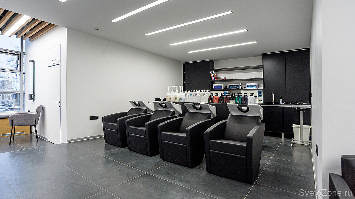 В проекте использованы профили разной ширины в сочетании с лентами дневного белого свечения. Линии света гармонично интегрированы в потолочные деревянные перекрытия. Широкие световые полосы отражаются в стеклянных стенах, визуально расширяя границы помещения. Стильный контраст белого и черного достигается за счет использования ярких световых линий на черном глянцевом потолке. Ленты с высоким индексом цветопередачи в тандеме с матовыми экранами обеспечивают яркое и в то же время равномерное освещение. В офисной части салона красоты использованы стильные подвесные круглые светильники с внутренним свечением, напоминающие настоящие арт-объекты. Линейные подвесные светильники обеспечивают достаточный уровень освещенности и оригинально смотрятся в любых интерьерах.