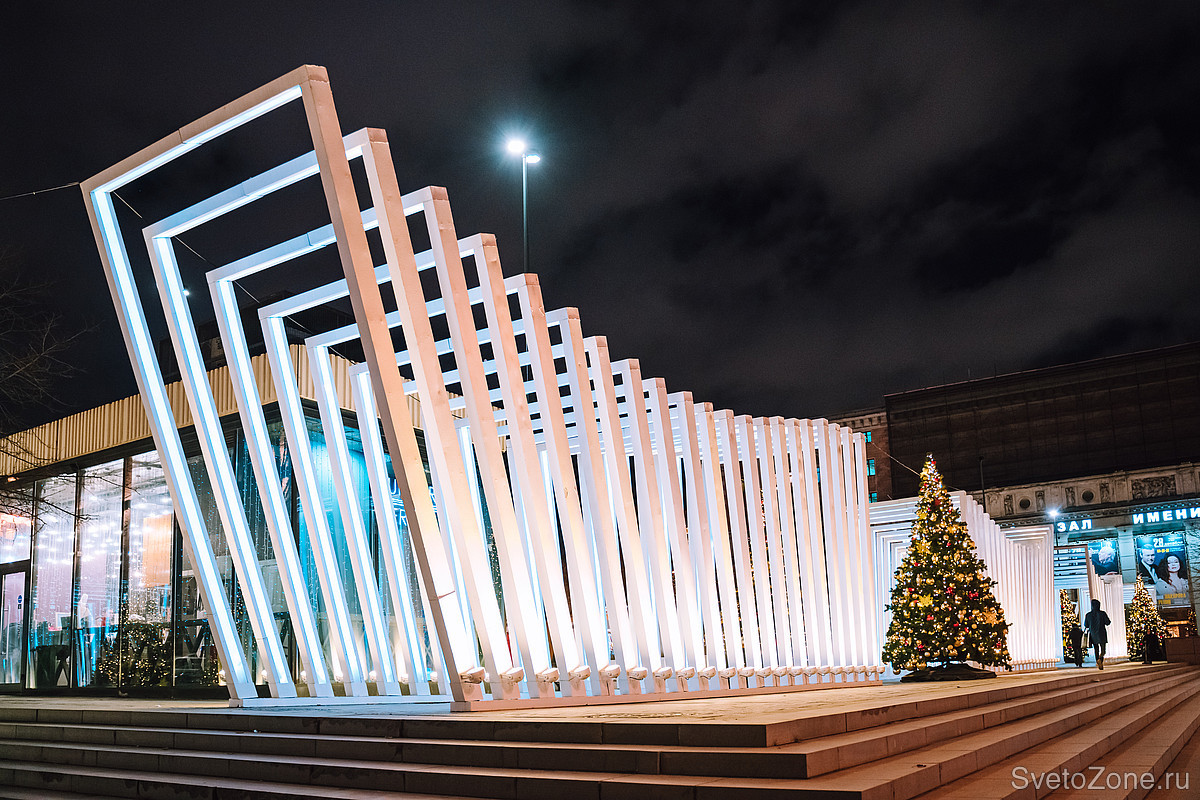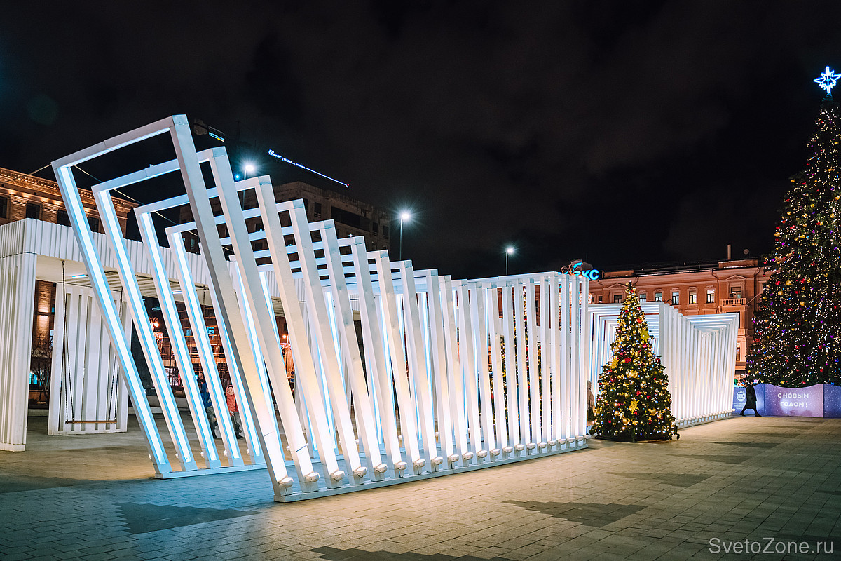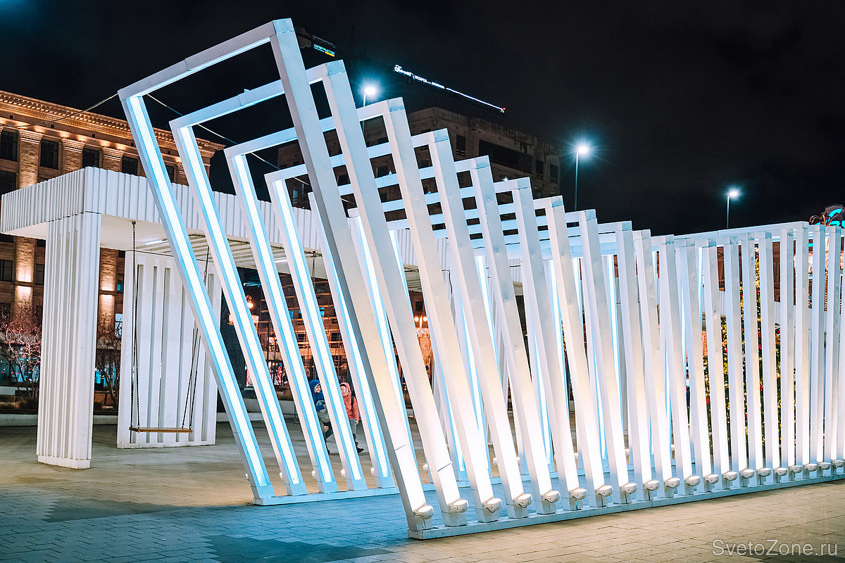 Площадь имеет довольно ярко выраженную геометрию, которая дополнительно подчеркнута конструкцией парковых качелей. Чтобы поддержать эту особенность и гармонично вписать в пространство новогоднее украшение, при разработке концепции инсталляции мы отдали предпочтение геометрической форме тоннелей.