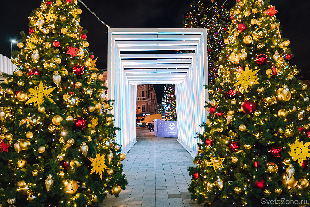 Чтобы разбавить строгость форм, между каждой парой тоннелей мы установили искусственные ели высотой 6 м. Доминантой композиции стали искусственные ели высотой 8 м, установленные на противоположной от тоннелей части площади. Все ели украшены игрушками в золотой гамме и оформлены светодиодной гирляндой. |