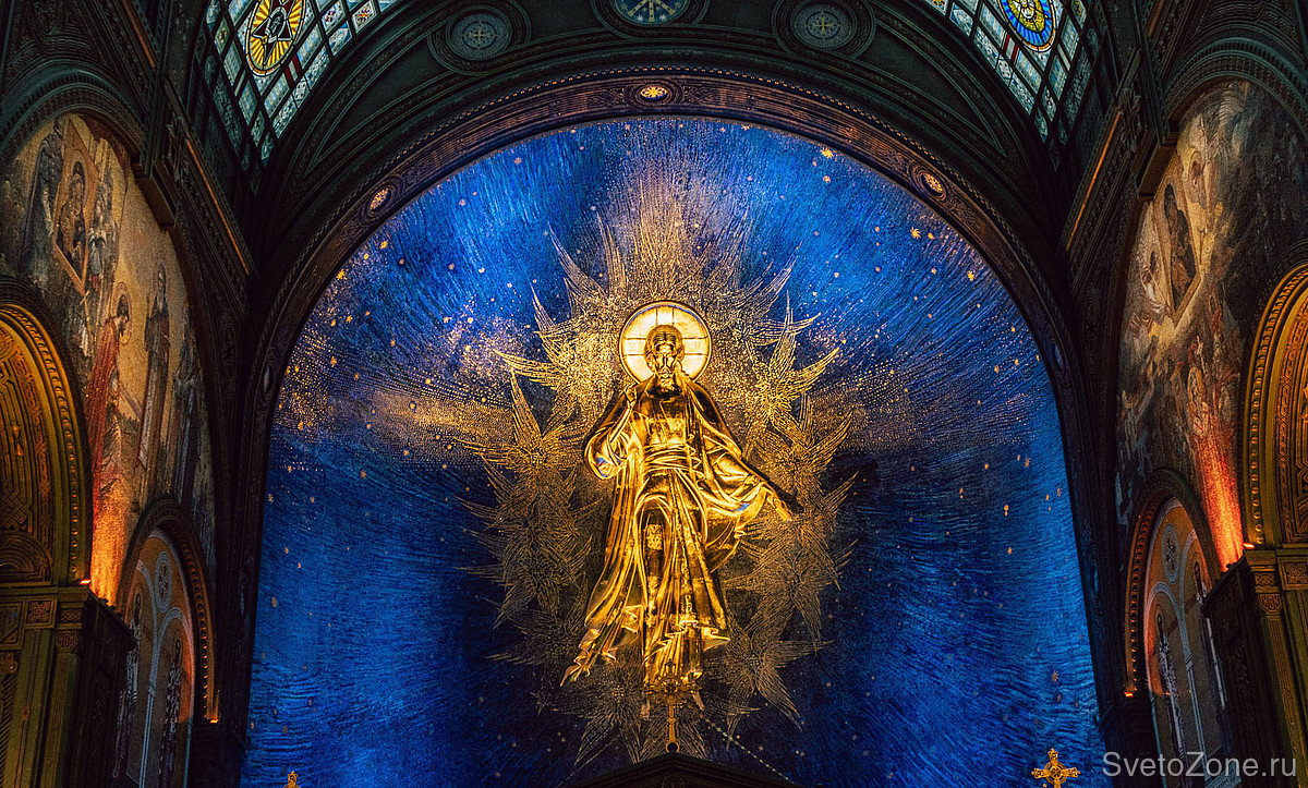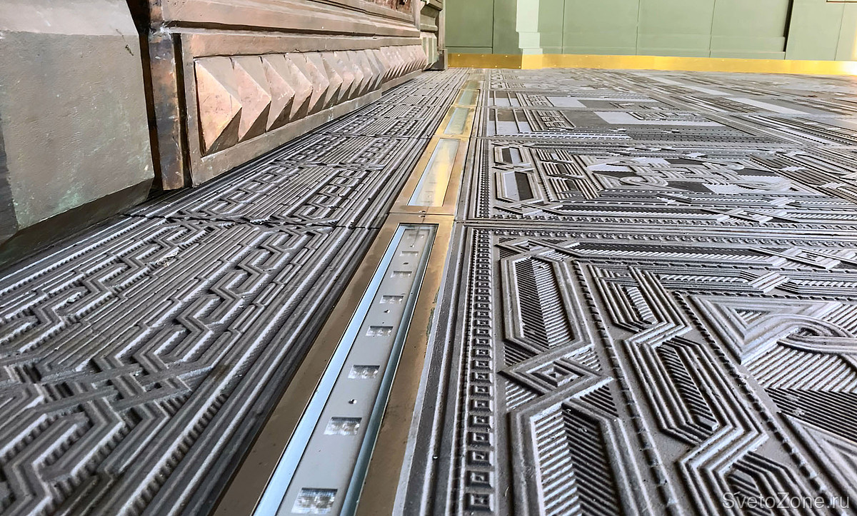 Световые приборы в исполнении IP67 искусно установлены в пол из чугунных плит. Наружные фланцы изготовлены из матированной нержавеющей стали, прекрасно вписаны в общий "железный" экстерьер "железного" храма и не нарушают визуальной гармонии. Светящая поверхность изделий выполнена из закаленного кварцевого стекла высочайшего качества и прочности.