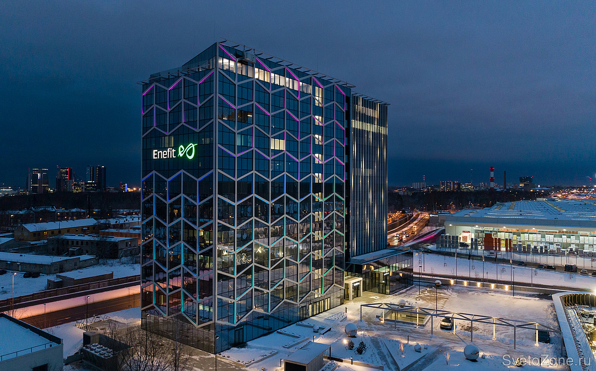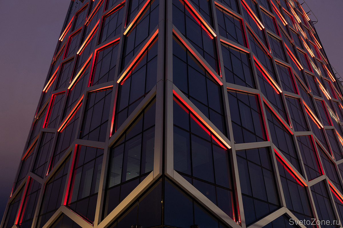 Акцентирующее освещение металлических элементов фасада — доминанта светового концепта, реализованная при помощи RGBW светильника #EDGE. На торцевые части объекта было установлено 132 световых прибора, они составили эффектный визуальный контраст с зеркальными панелями здания. Особенности тороидальной оптики светильника помогли нам избежать нежелательных световых эффектов, что также крайне важно, так как проект подразумевает под собой как офисные, так и жилые помещения.