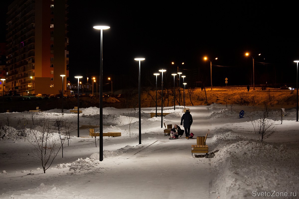 Менеджеры Ledvizor помогли подобрать оборудование для освещения нового общественного пространства. Торшерные светильники LV-TORCHERE, установленные на 5-ти метровые опоры, обеспечивают мягкое освещение на всей территории. Консольные светильники LV-CITY отвечают за освещение дорожек в центральной части сквера.