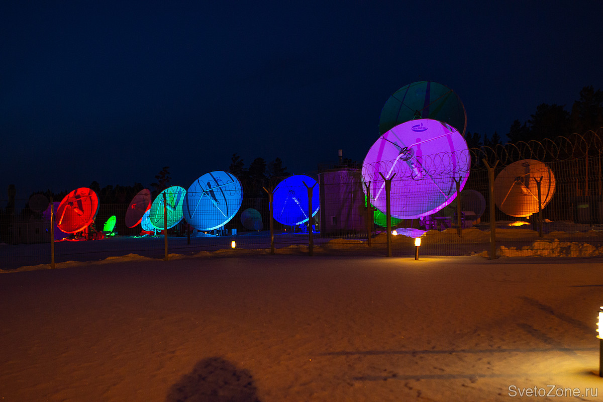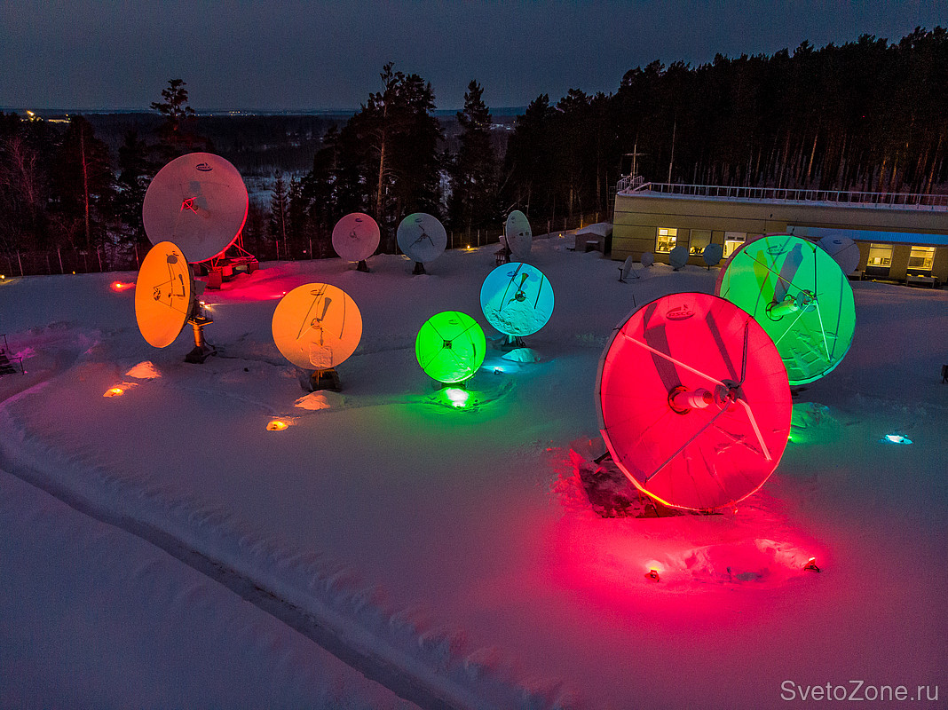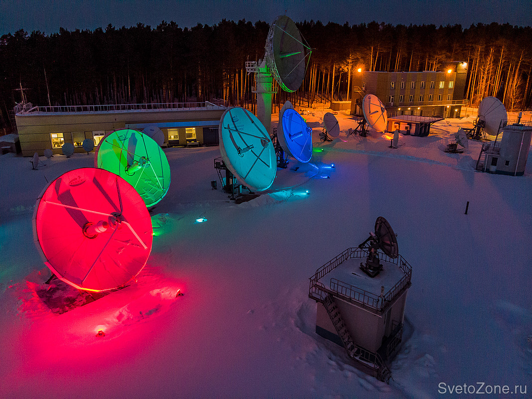 В 2020 году мы реализовали еще один интересный проект. На этот раз перед командой Ledvizor стояла задача сделать подсветку спутниковых тарелок на территории Центра космической связи (ЦКС) в Железногорске.