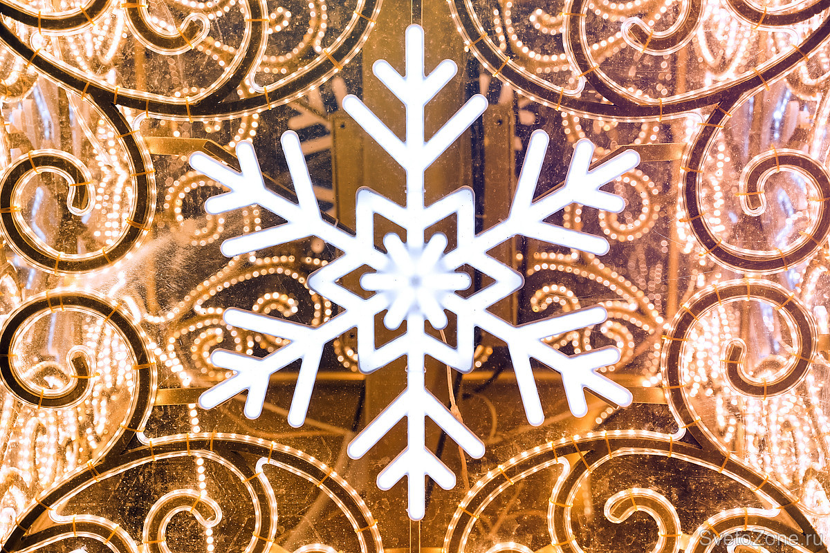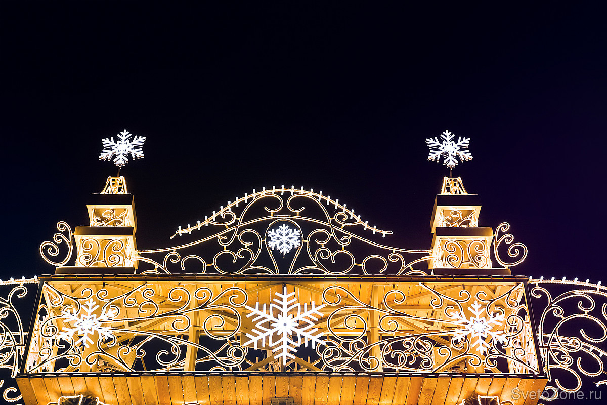 Для светового оформления выбраны гирлянды и светодиодная лента теплого белого свечения, контурирование выполнено белт лайтом.