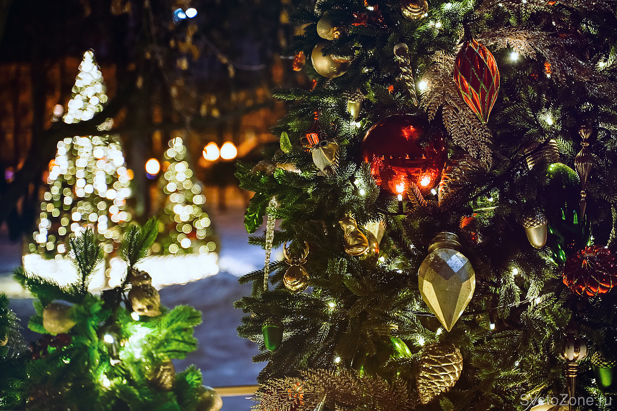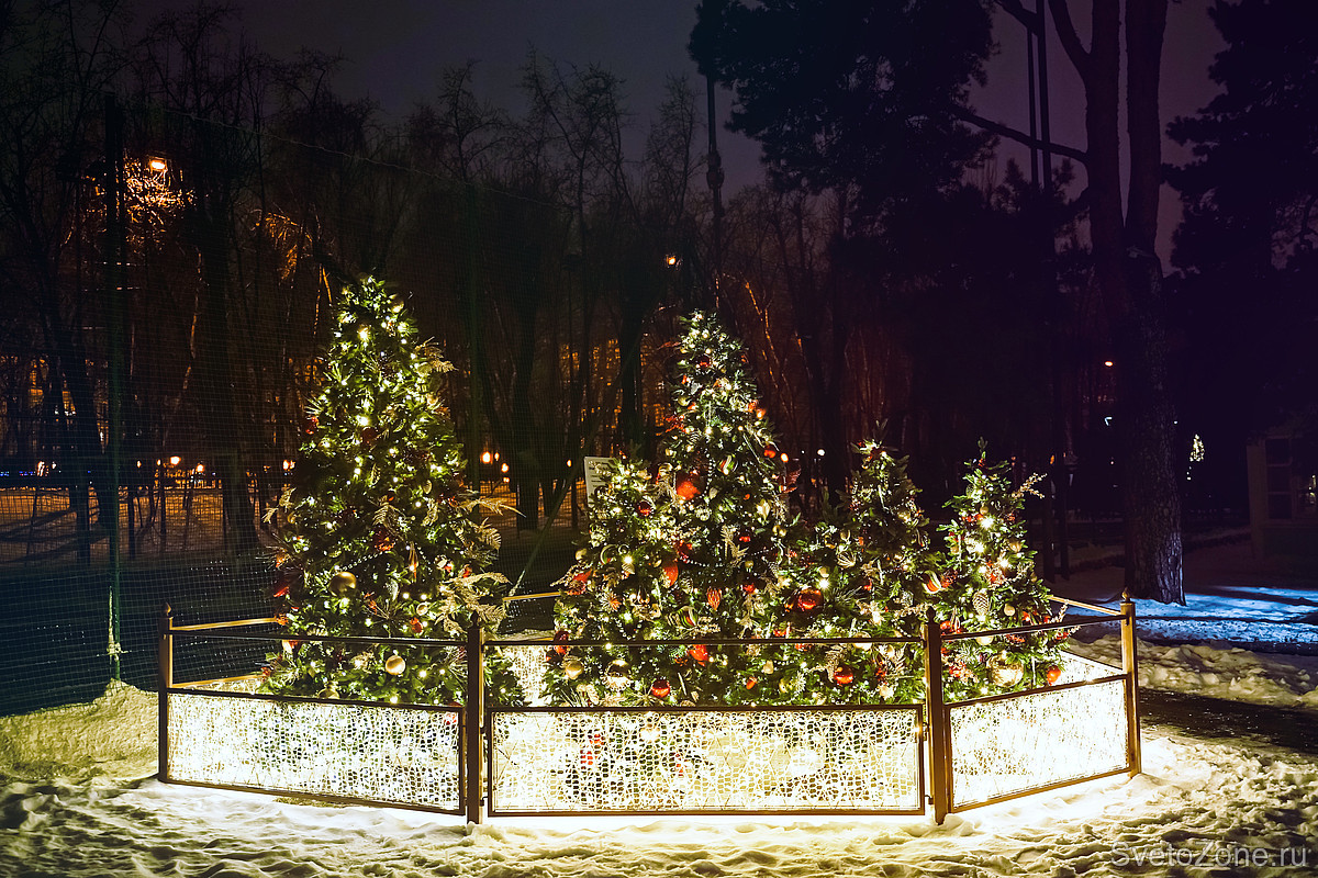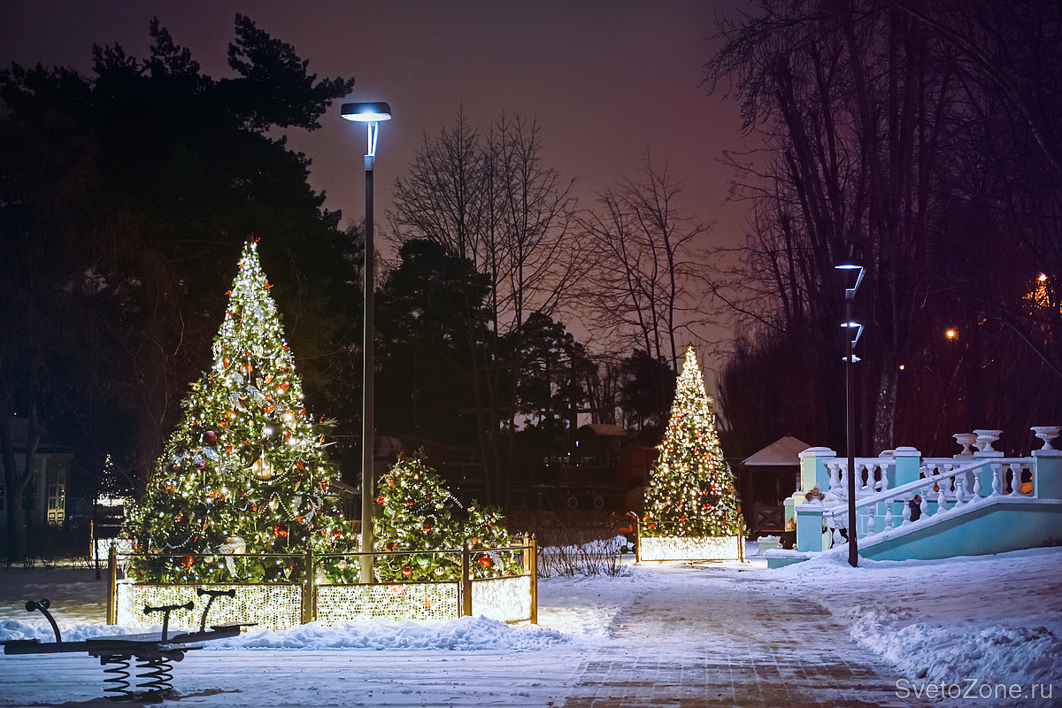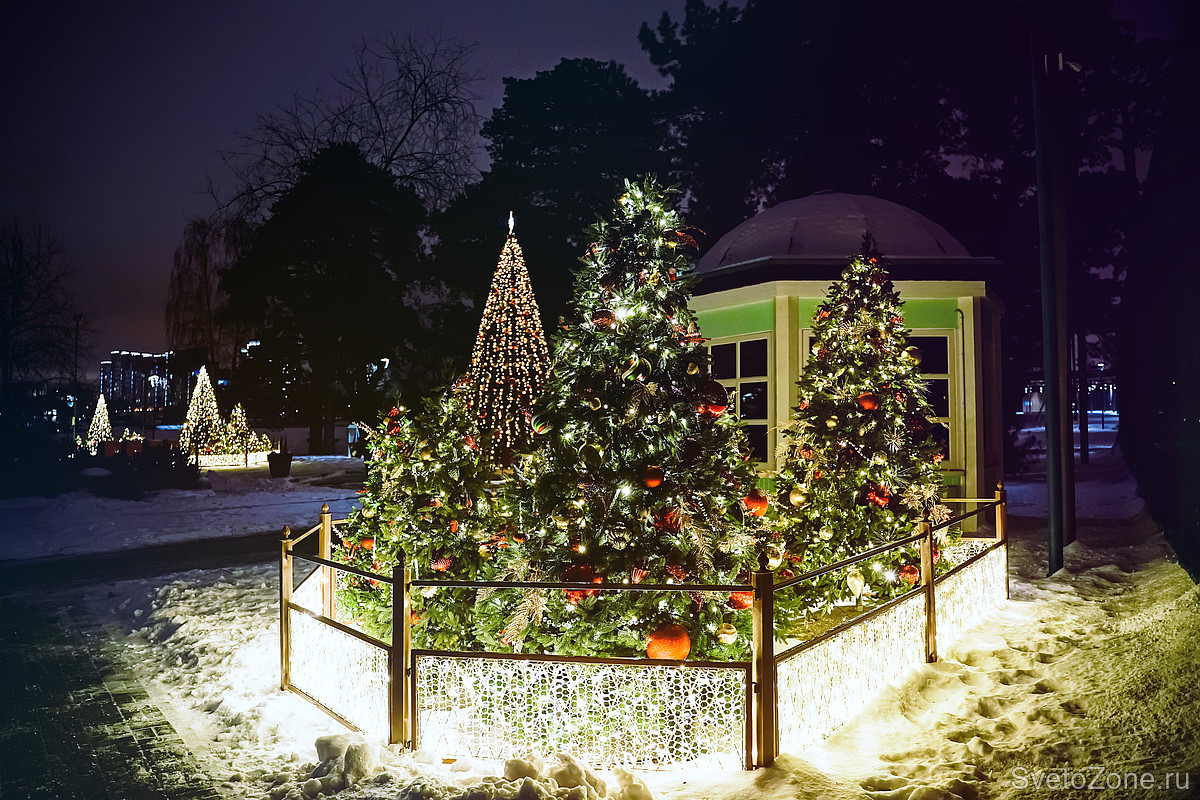 В световом оформлении использован теплый белый свет — это гирлянды на елках и декоративных ограждениях островков. Свет гирлянд не только создает новогоднюю атмосферу, но и служит дополнительным источником света в вечернее время. |