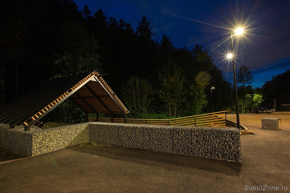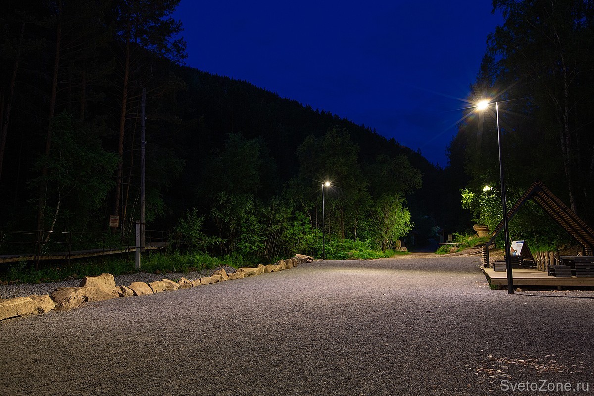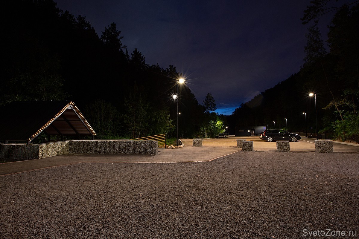 За освещение новой расширенной парковки и зон отдыха отвечают уличные светильники LV-CITY. Приборы Ledvizor подобраны с цветовой температурой в 3000К. Тёплая цветовая температура и ассиметричная широкая оптика создают мягкий комфортный свет. Такое освещение лаконично вписалось в экосистему национального парка.