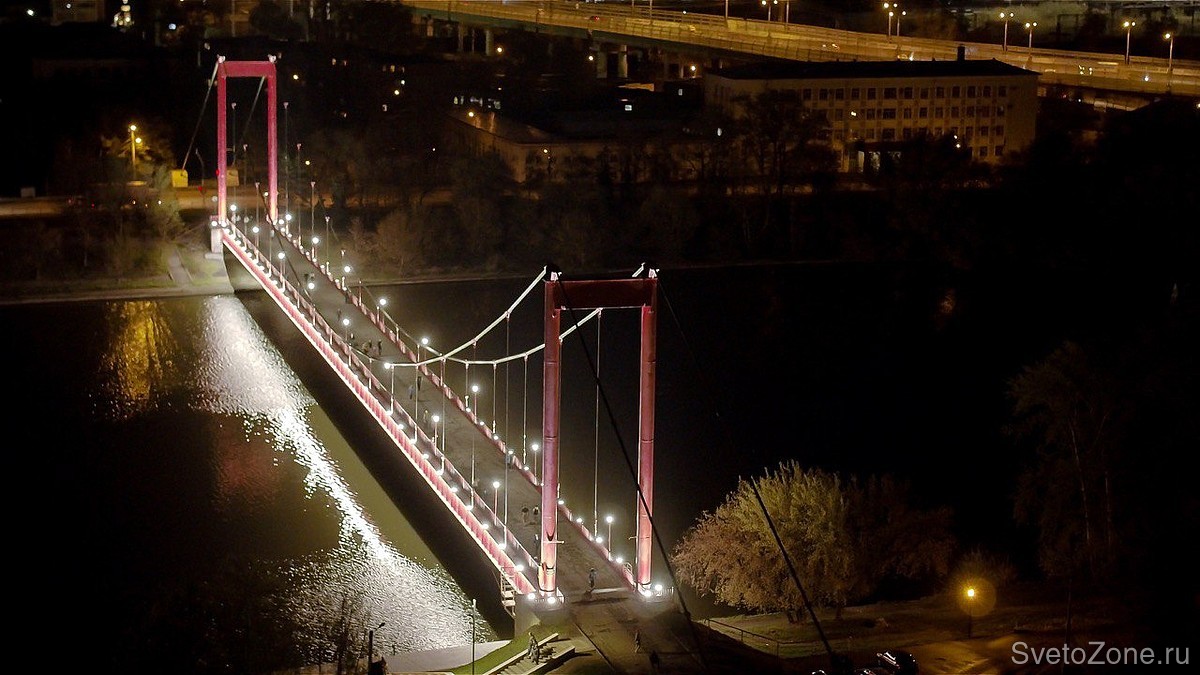 На мосту установили более трехсот светодиодных светильников "ФЕРЕКС" разного типа. Для заливающей подсветки "тела" моста использовали трубчатые светильники серии FPL. Локальную подсветку колонн и вантовых конструкций организовали с помощью мощных светодиодных светильников серии FHB и FWL. Пешеходную зону осветили торшерными светильниками ДТУ с опаловыми рассеивателями для создания мягкого освещения.