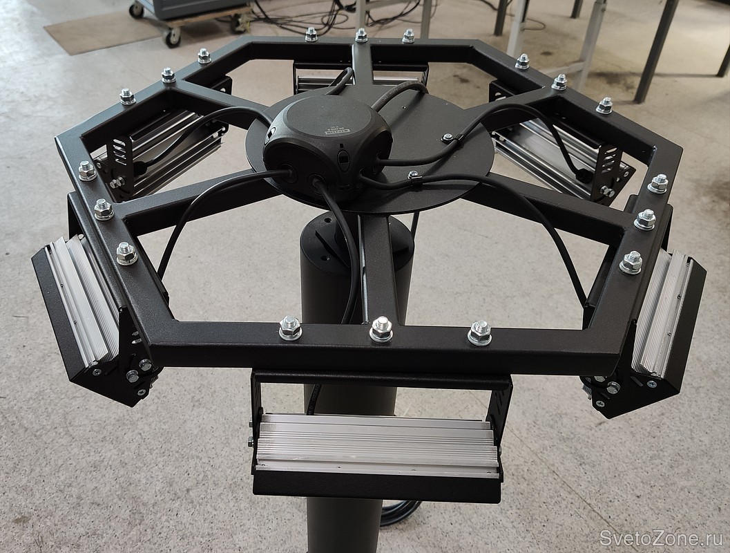 Менеджеры Ledvizor предложили использовать низковольтные светильники LV-HARD. Приборы обладают степенью защиты IP67 и работают в сетях 12-24 вольт, то есть светильники подключаются с помощью бортового питания. Наши инженеры разработали мини-корону и опору для установки на дробильную установку.