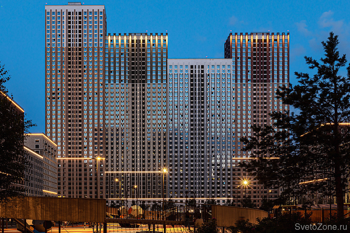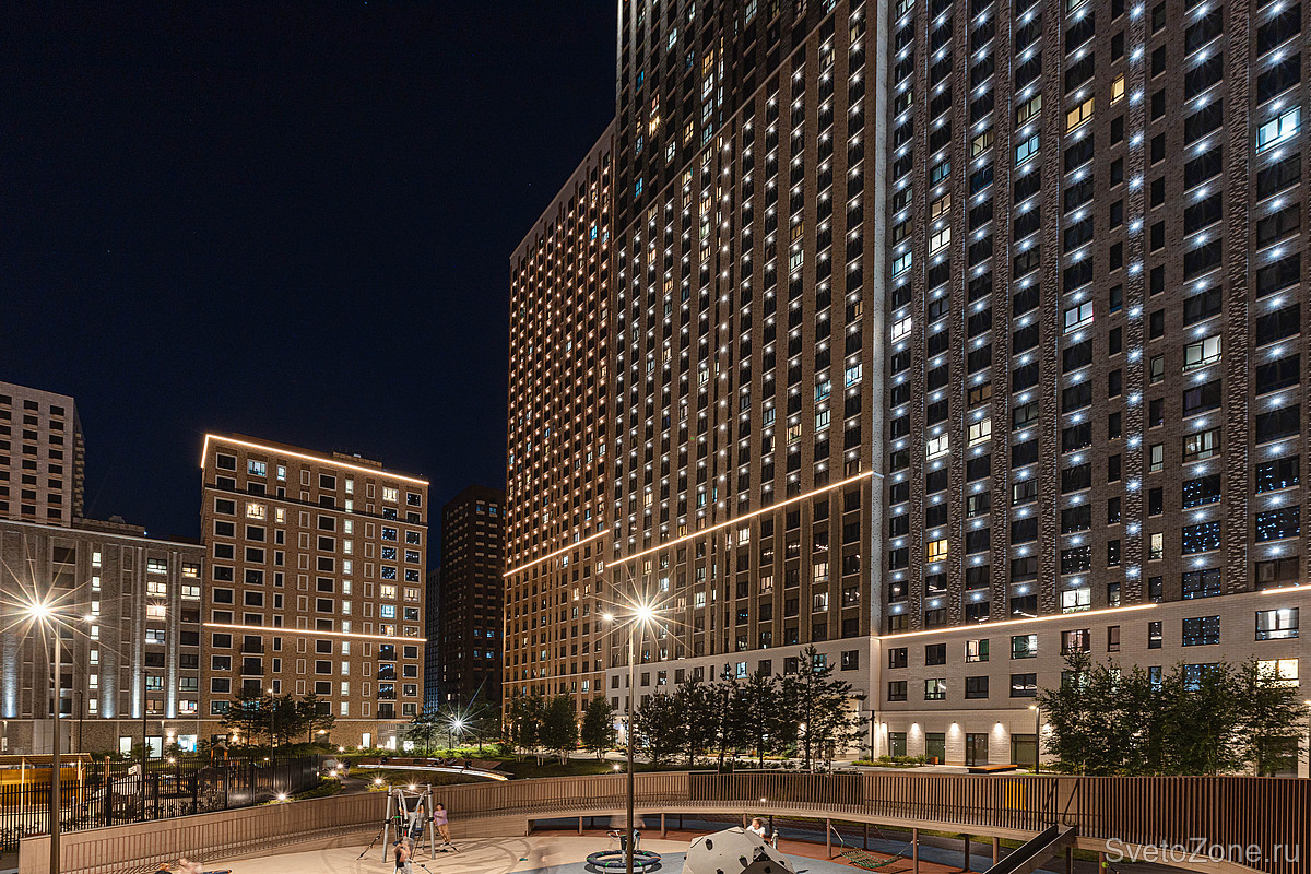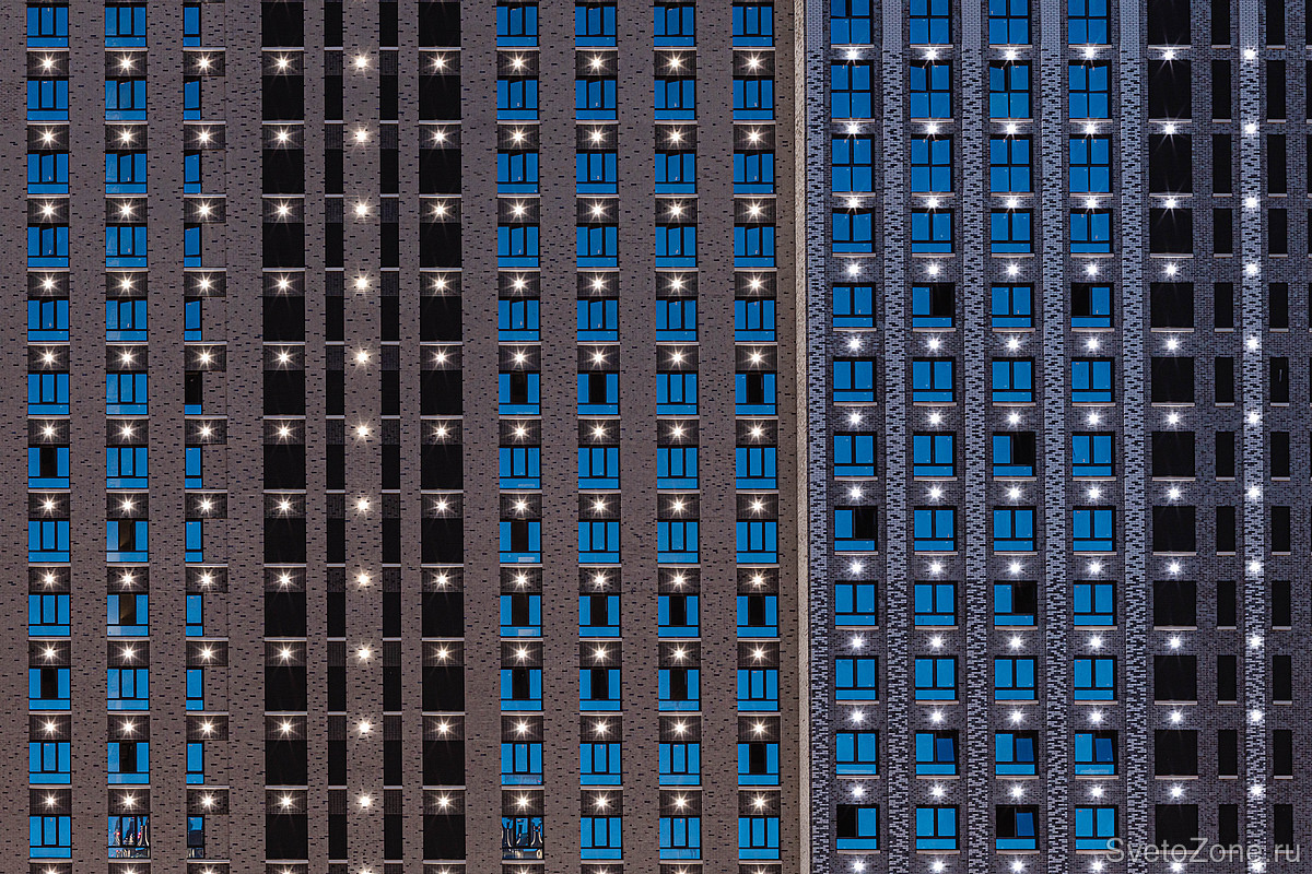 Для дальнего восприятия зданий комплекса светом подчеркивали архитектурный ритм, выявляли гибкость фасада и дифференциацию в отделке. На высоких корпусах основу ритма составляет модульная сетка, выполненная с помощью точечных светильников высокой яркости IntiPOINT.