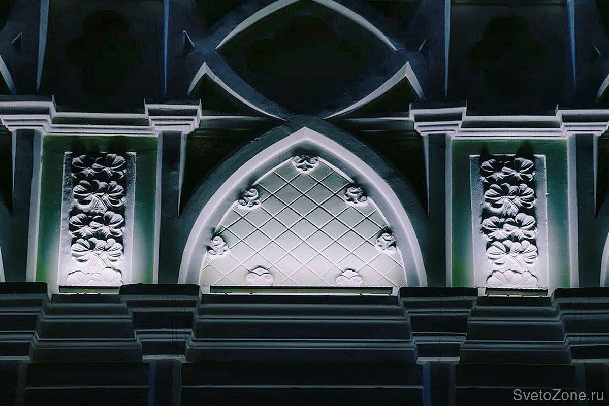 С уровня нижнего карниза в оконных проёмах также были установлены линейные светильники, которые выделили окна и архитектурные элементы над ним. Для выделения изящных пилястр были также выбраны короткие светильники серии LINE, установленные на том же уровне. Для освещения филенки в подоконном пространстве идеально подошёл светильник IntiSLIM, его небольшой корпус буквально слился с карнизом и не обращает на себя внимание, а свет выделил все рельефные элементы и подчеркнул фактуру фасада.