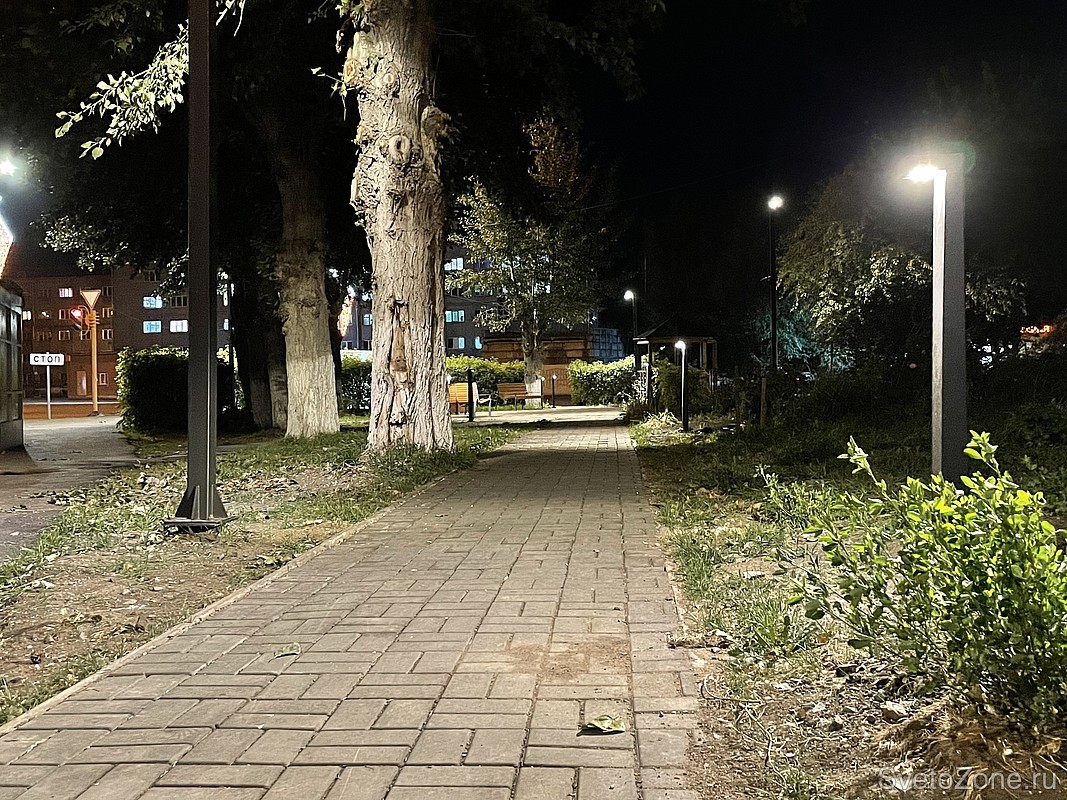 За локальную подсветку лавочек и пешеходных дорожек в сквере отвечают светильники LV-SEVEN. Г-образные болларды гармонично интегрировались в облик зеленного сквера. Каждый вечер они создают мягкий и комфортный свет. Благодаря высоте всего в 1100 мм, светильники не ослепляют прохожих.