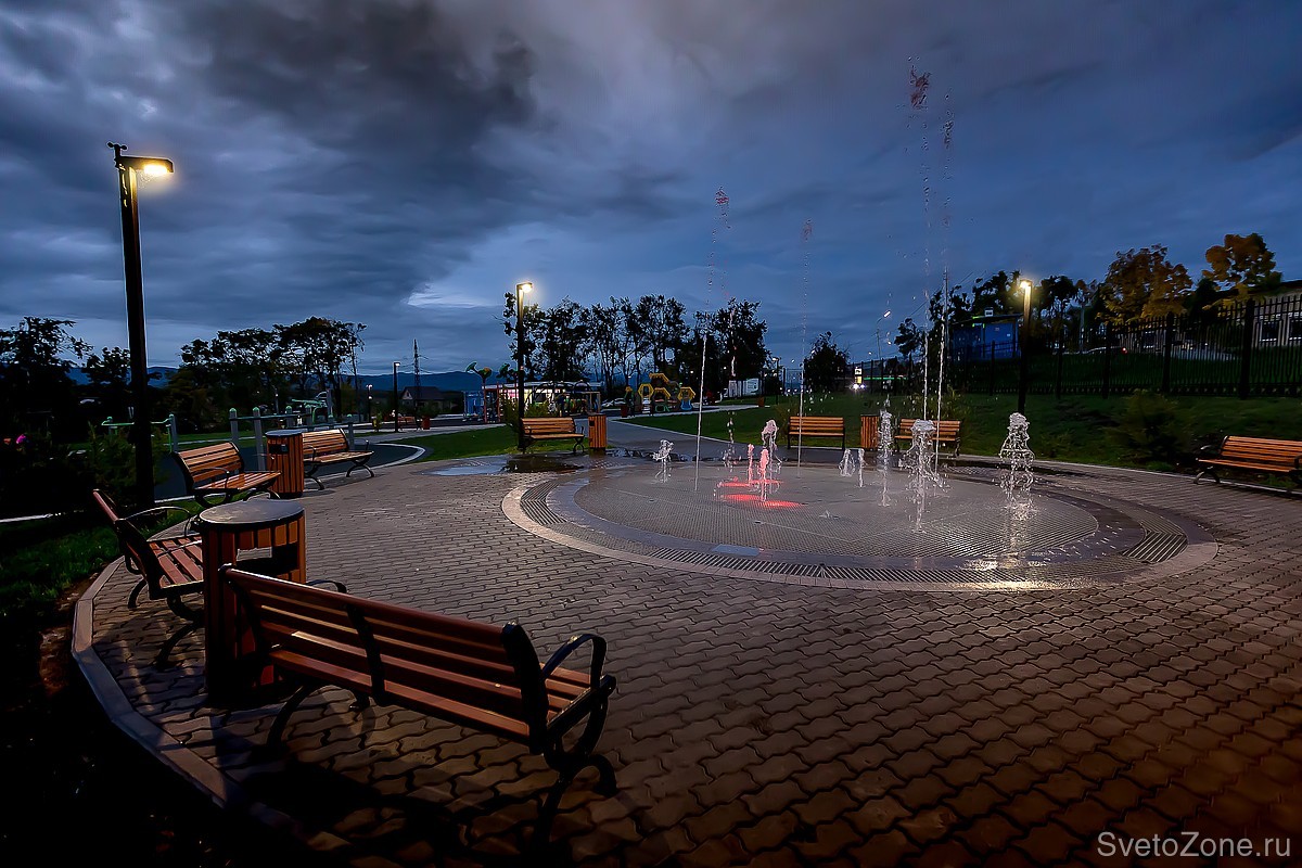 Интегрированные в опору светильники LV-INTEGRATED TYPE-B отвечают за общее освещение сквера. Приборы Ledvizor установлены вблизи игровой площадки и площадки с фонтанами. Светильники с цветовой температурой в 4000 К освещают места отдыха и акцентируют внимание на элементах благоустройства.