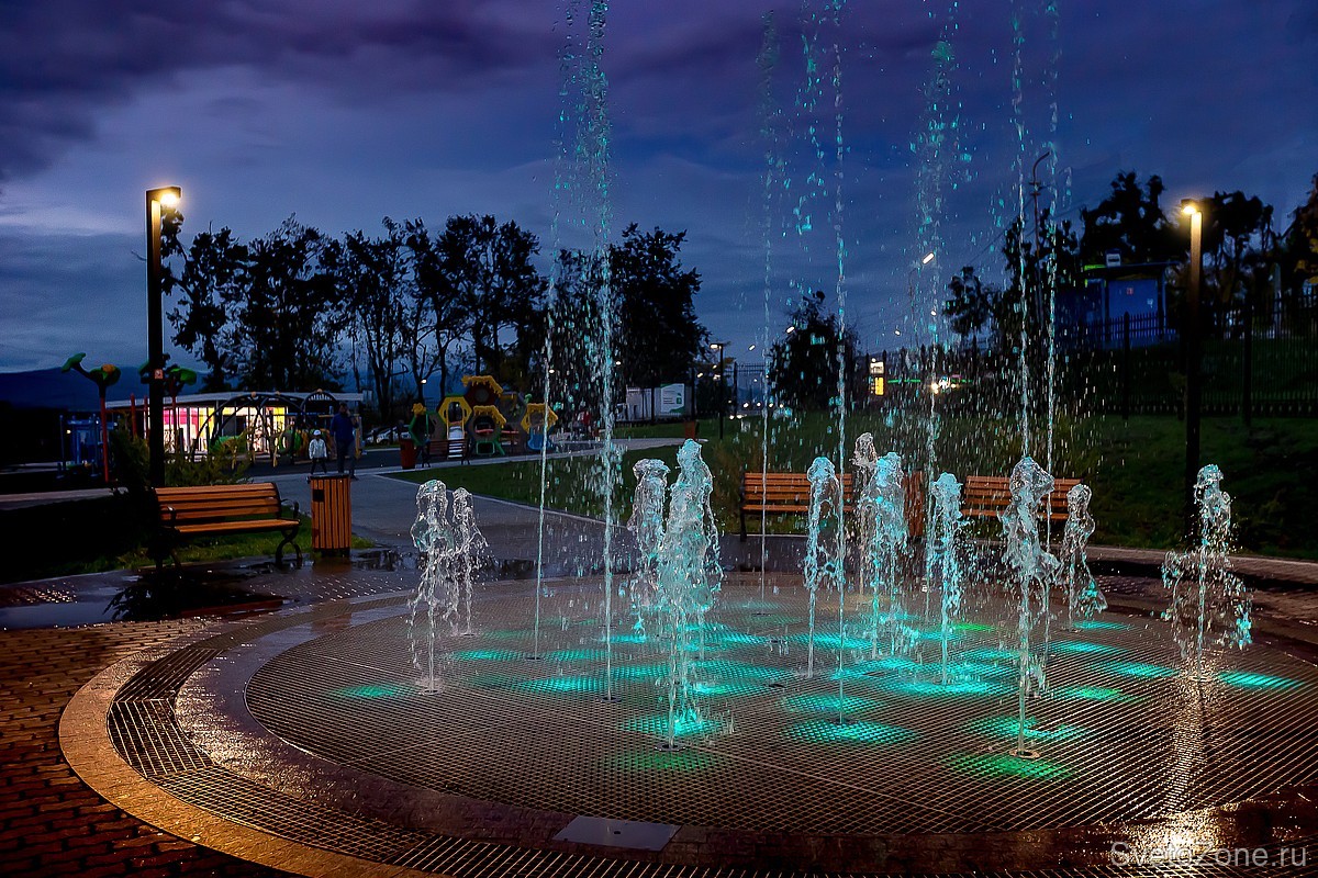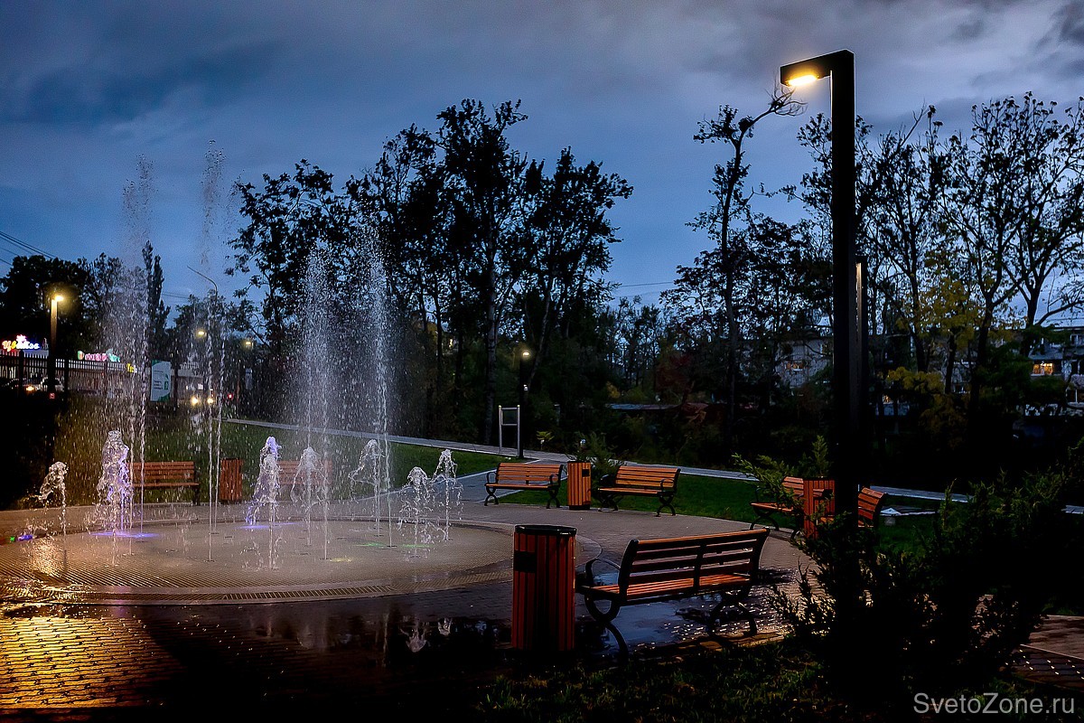 Вечером светильники и цветные фонтаны существенно изменяют облик сквера. Общественное пространство играет другими красками и становится интереснее для посетителей в вечерние часы.