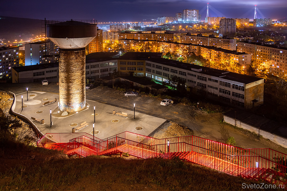 Территория сопки обзавелась освещением. Интегрированные в опору светильники LV-INTEGRATED TYPE-C отвечают за функциональное освещение общественного пространства. Приборы установлены на площадке возле водонапорной башни и на смотровых площадках.
