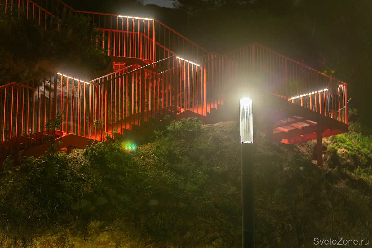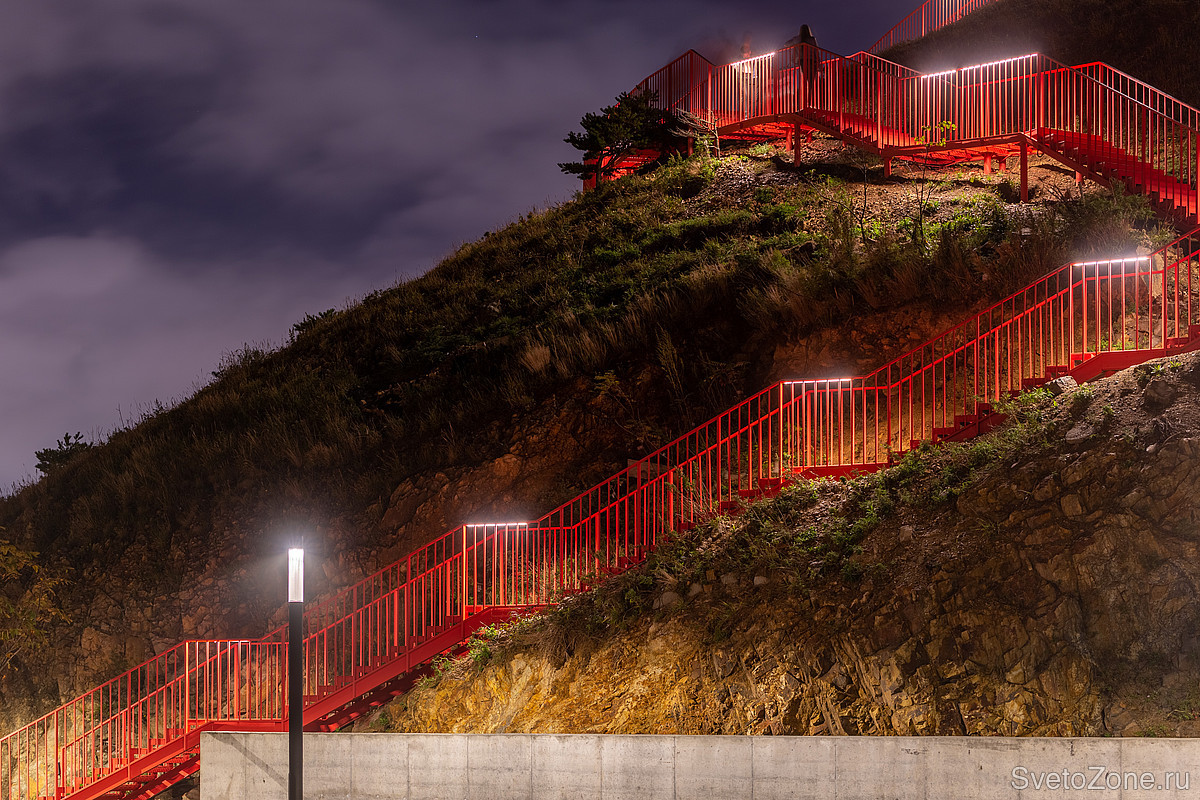 Линейные светильники LV-LINE интегрированы в лестницу и отвечают за навигационную подсветку. Они помогают безопасно добраться до вершины сопки в вечернее время суток.