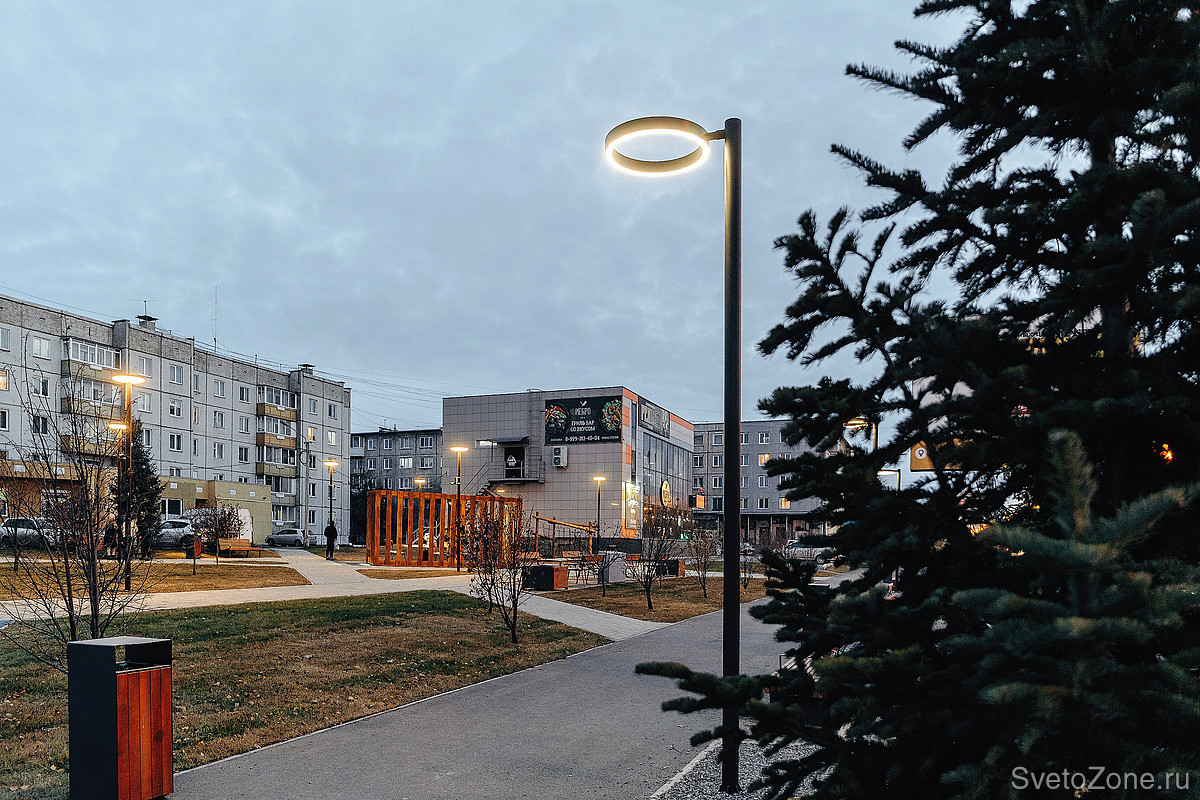Жемчужиной сквера стали интегрированные в опору кольцевые светильники LV-INTEGRATED TYPE-О. Матовый рассеиватель диаметром 700 мм создаёт мягкий и комфортный для людей свет. Кольцевые светильники не только отвечают за освещение, но и являются важным элементом дизайна общественного пространства.