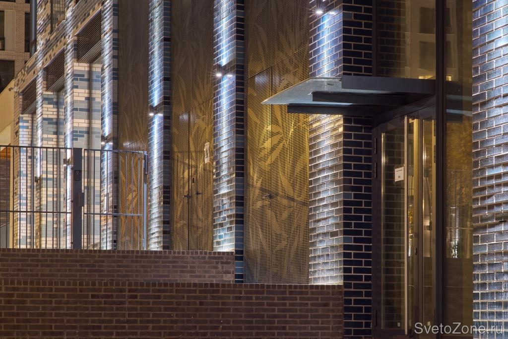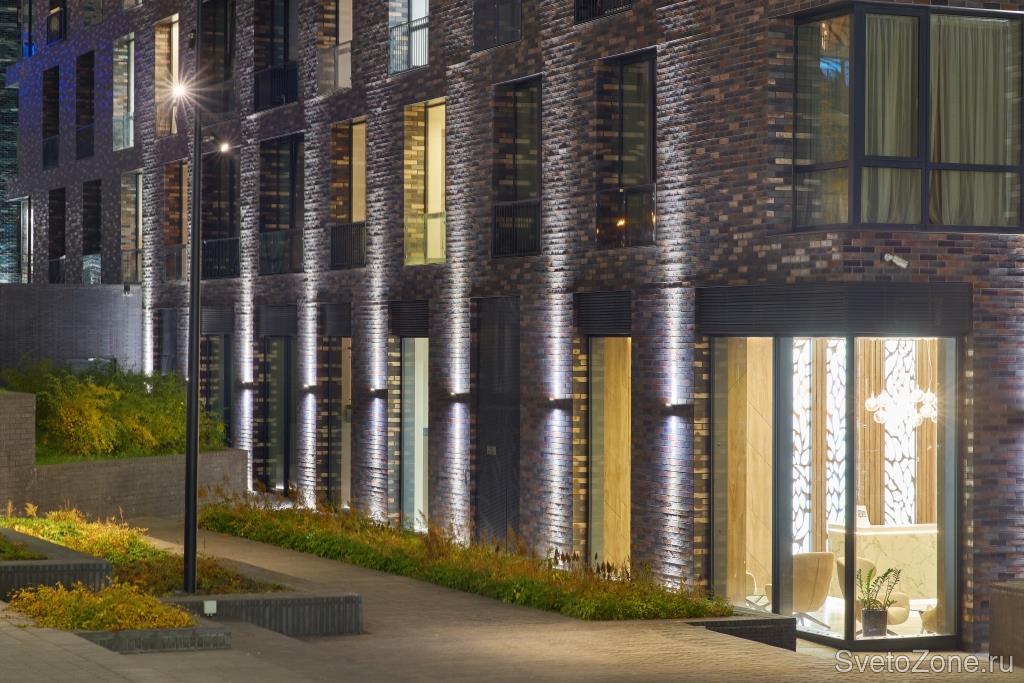 Важная часть архитектурной концепции комплекса — индивидуальное дизайнерское решение в облицовке каждого корпуса. Однако при реализации проекта мы столкнулись с тем, что клинкерная плитка благородных цветов в свете прожекторов RADUGA™ DUPLEX приобретала тусклый оттенок. По просьбе заказчика, компании LIGHT4U, мы заменили светодиодные модули на имеющие более оптимальную цветовую температуру.