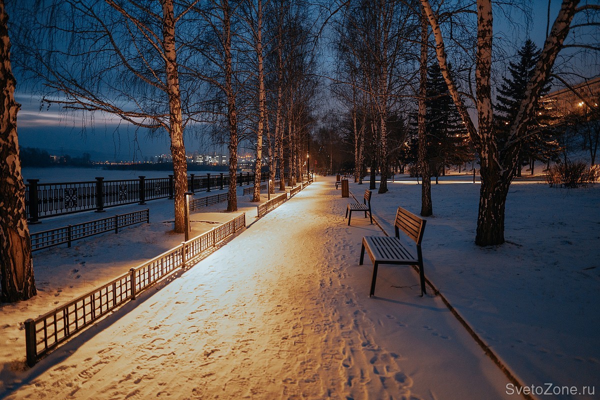 Приборы Ledvizor не только выполняют функцию освещения, но и являются украшением общественного пространства. Тёплый свет диодов наполняет уютом и чувством безопасности этот участок набережной. Светильники удачно вписались в облик левобережной набережной Енисея и сделали это место ещё притягательнее в вечернее время суток.