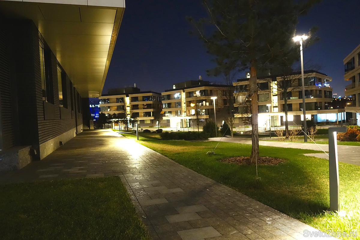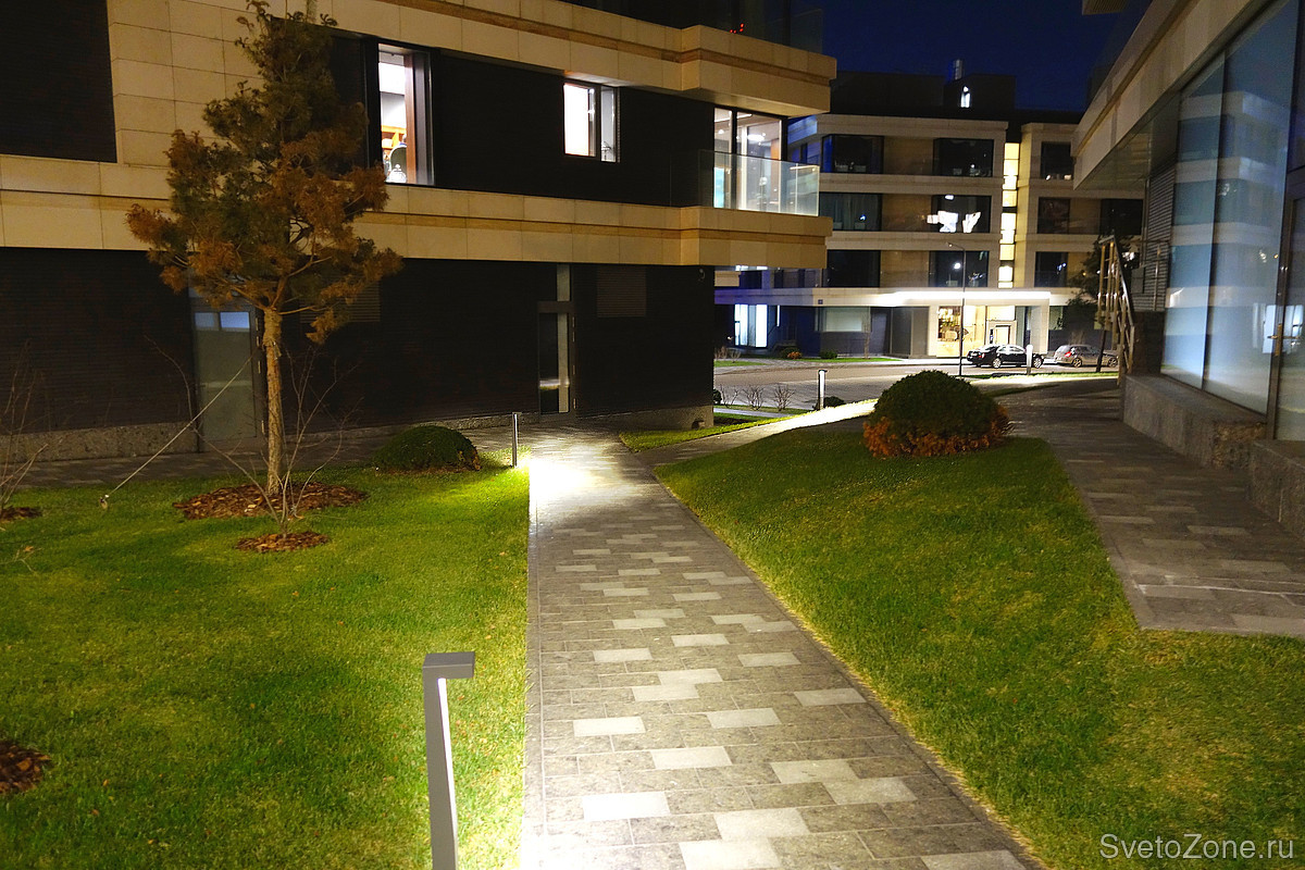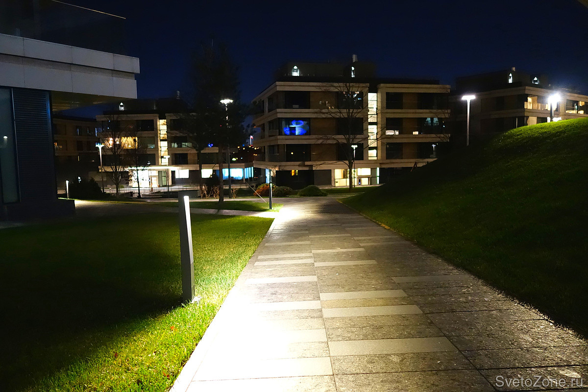 Для благоустройства экстерьера жилого комплекса использовались уличные светильники Ledvizor. Болларды LV-SEVEN освещают пешеходные дорожки. Г-образные столбики высотой всего 800 мм формируют пучок света таким образом, что даже при небольшой высоте болларда пятно засветки становится ярким и широким.