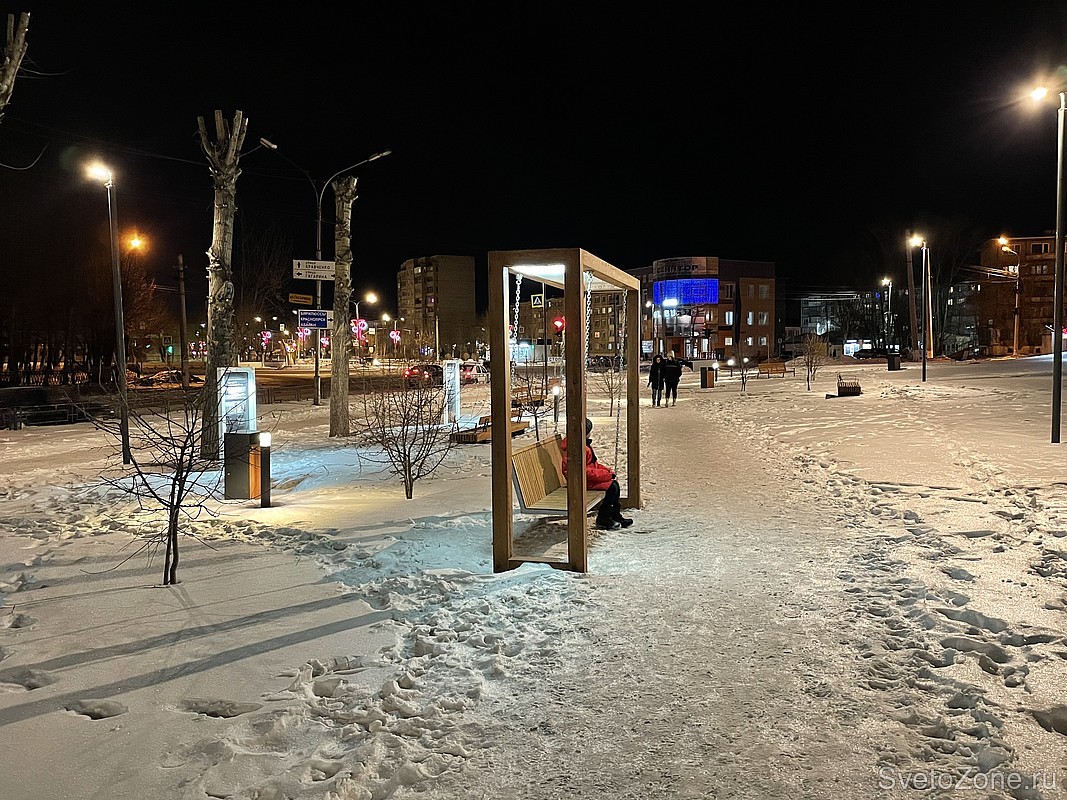 Раньше этот участок пешеходной тропинки вдоль улицы Кравченко почти не освещался. Свет на дорожки попадал только от фонарей старого образца с лампами ДНАТ, которые светят на проезжую часть. Сейчас в сквере появились современные светодиодные светильники.