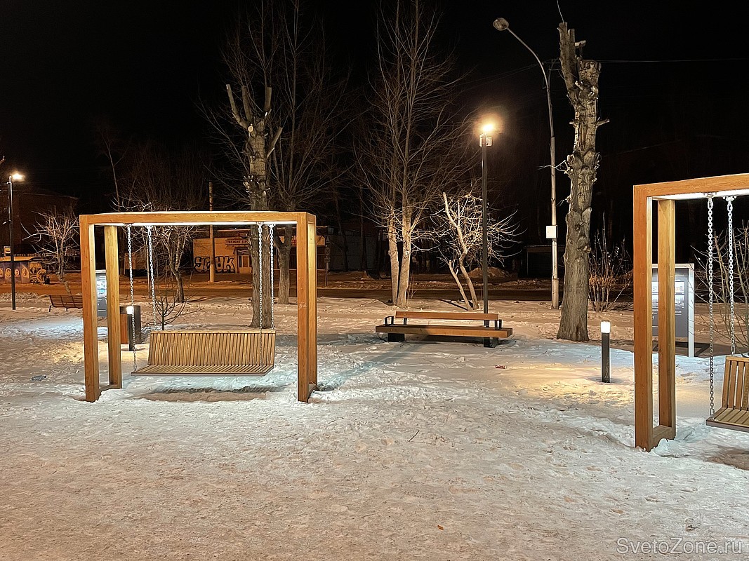 Вечером сквер становится светлым и притягательным местом. Болларды высотой 1,1 м создают уютную локальную подсветку вблизи лавочек и качелей. А за функциональное освещение дорожек отвечают парковые светильники LV-PARK. Благодаря новому освещению жителям стало намного комфортнее и безопаснее передвигаться через этот скверик.