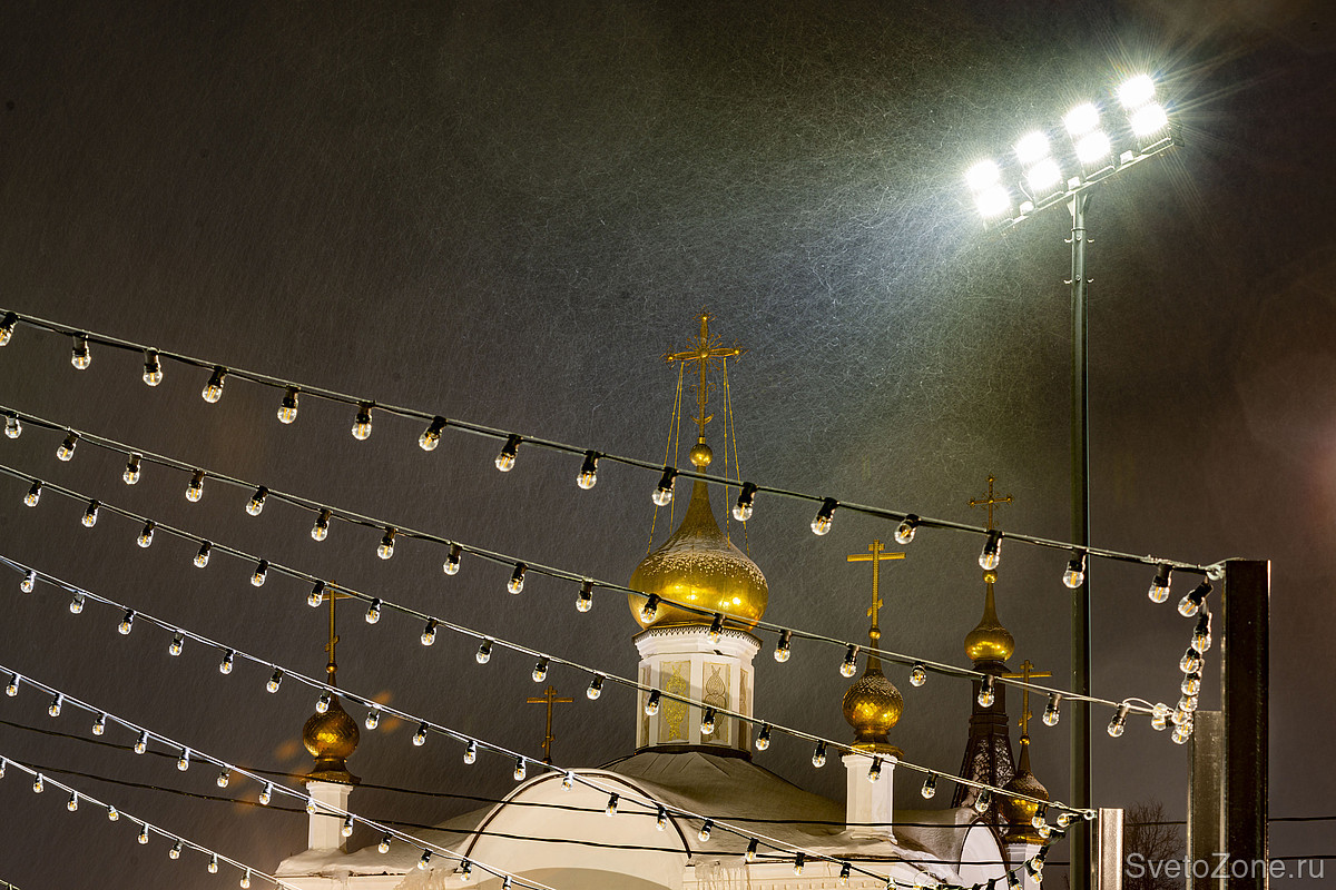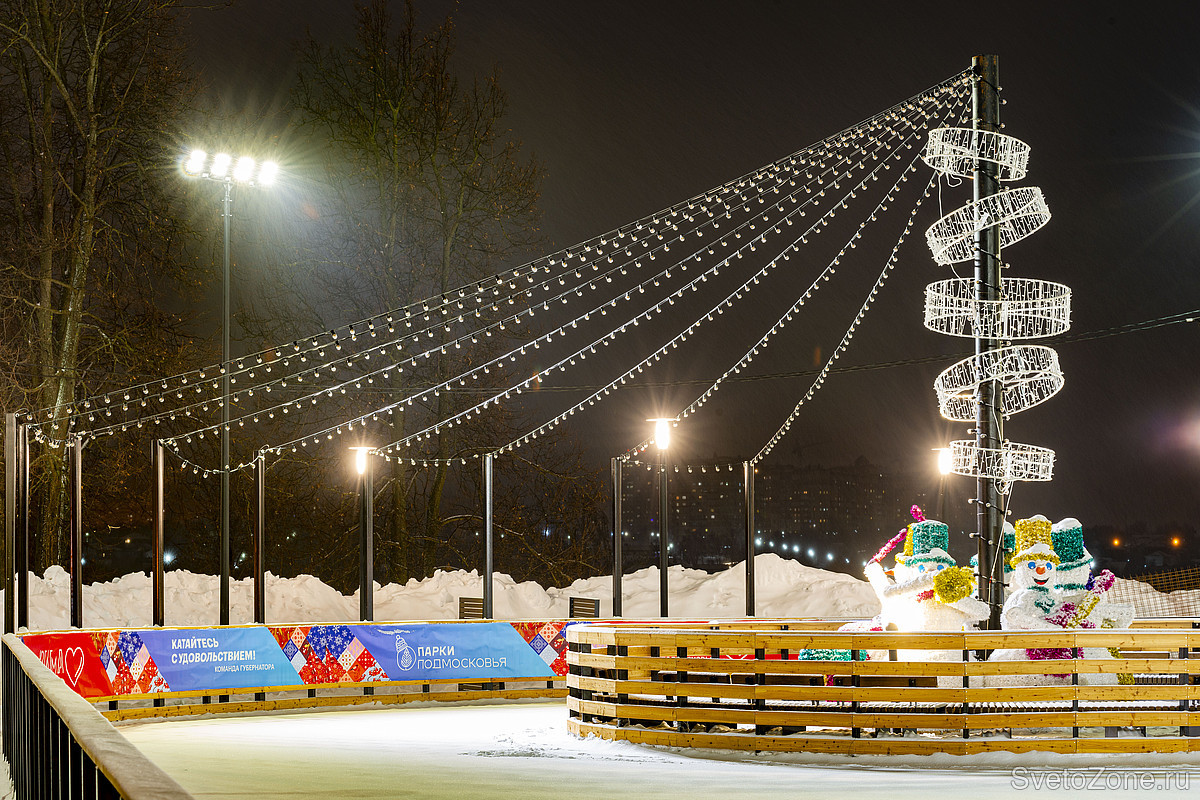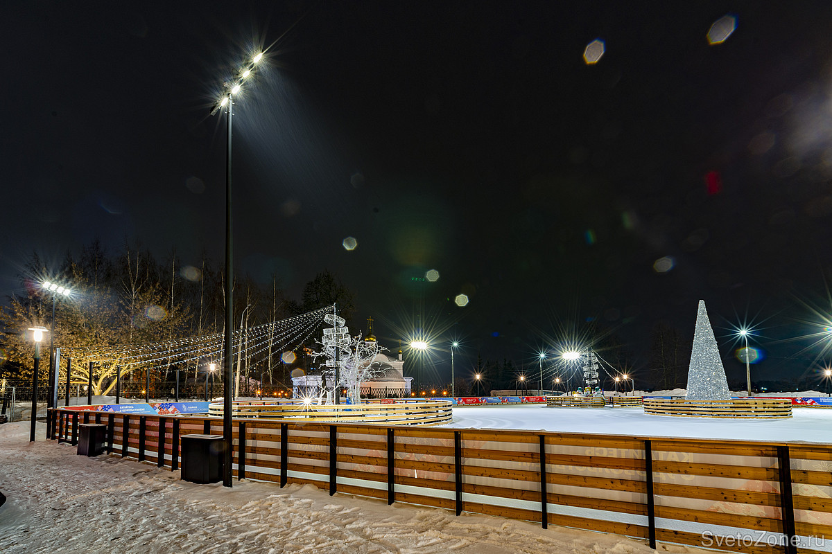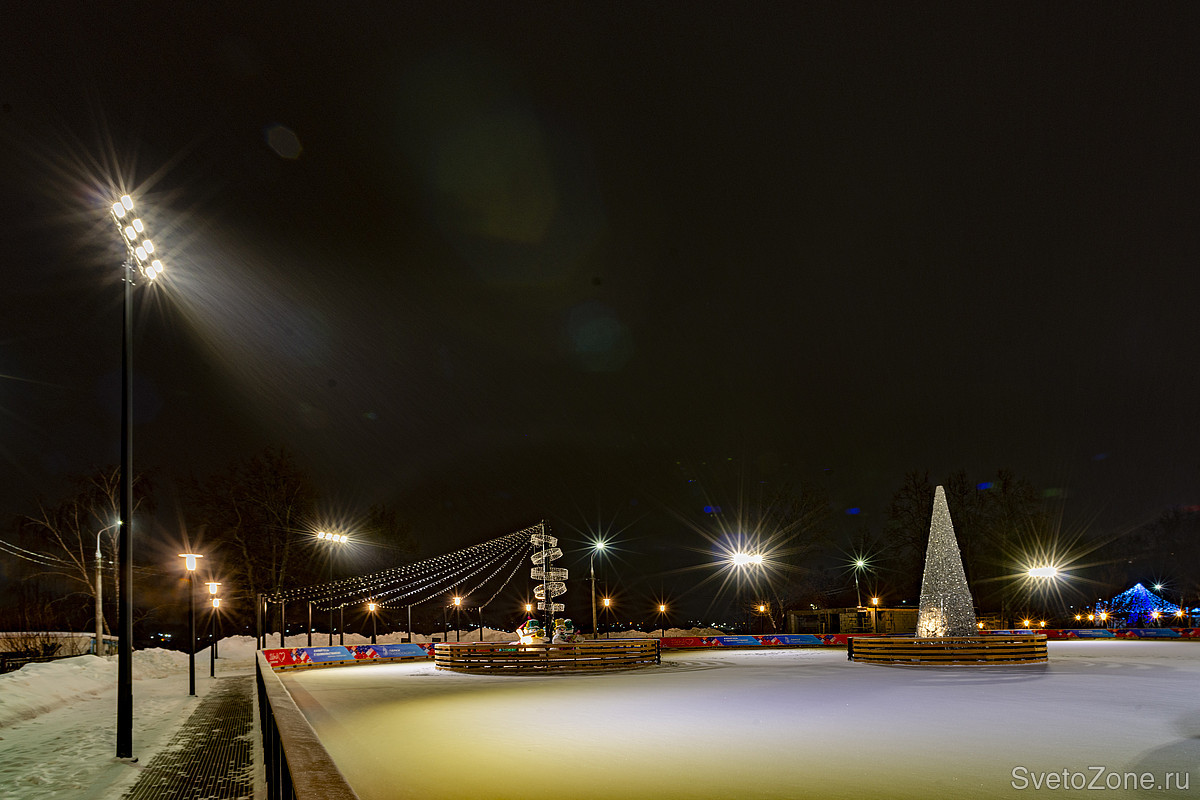 В конце прошлого года вокруг катка появилась современная подсветка. 32 архитектурных прожектора ARCU RADUGA ™ установлены по периметру на мачты-опоры. Яркий заливающий свет поддерживает атмосферу праздника, заряжает позитивом и энергией. Цветовая температура 4000 К соответствует естественному белому свету в дневное время, в период максимальной двигательной активности.