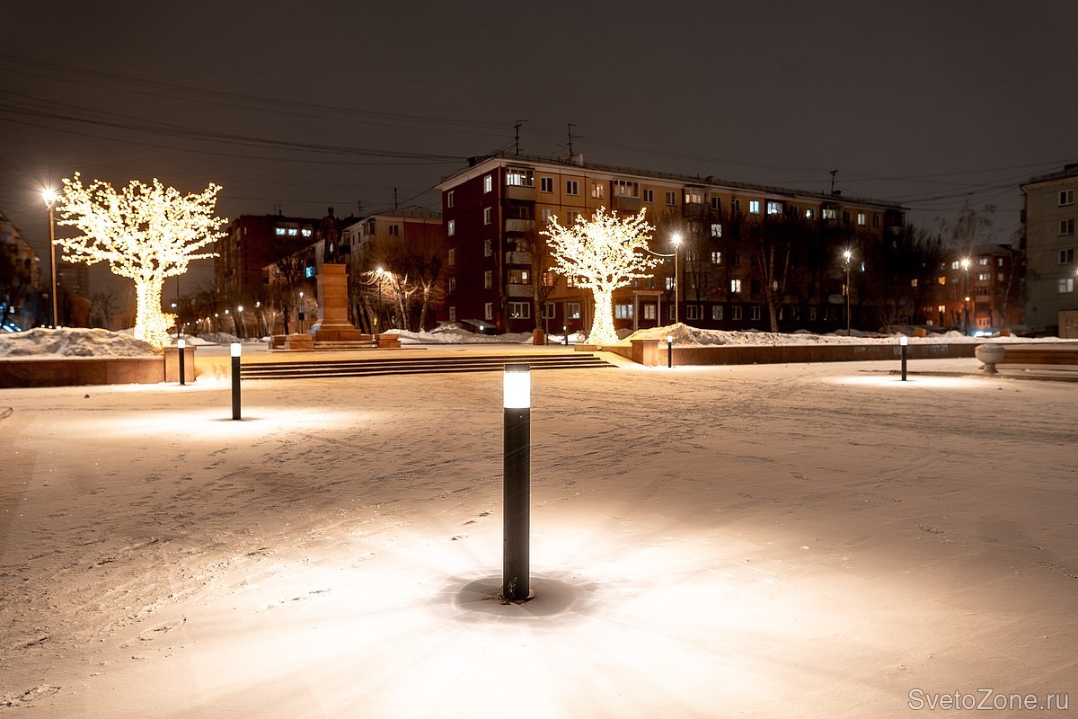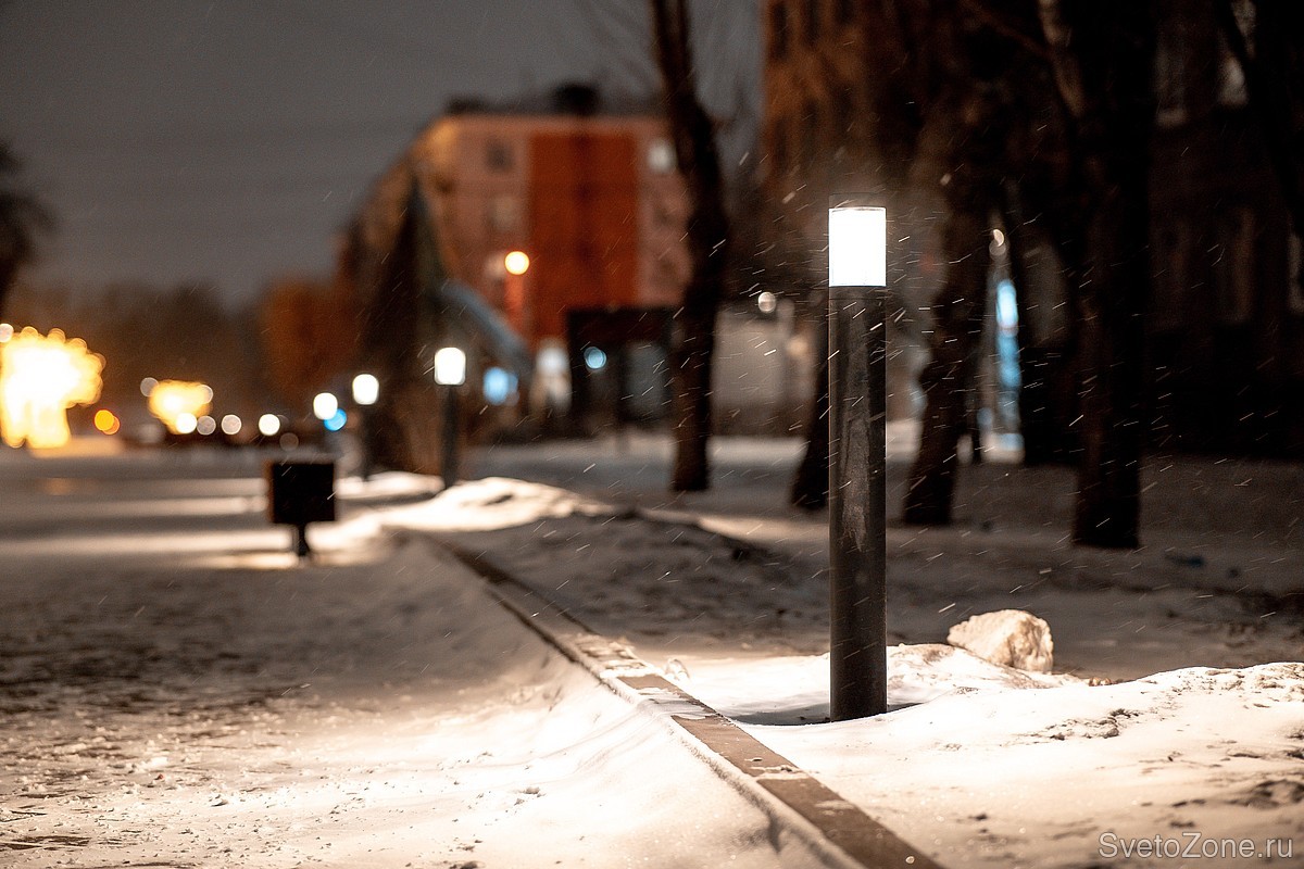 За освещение общественного пространства отвечают болларды LV-BOLLARD. Уличные светильники с акриловыми линзами и высотой 1,1 м создают тёплый и комфортный свет. При этом светильники не слепят глаза прохожих.